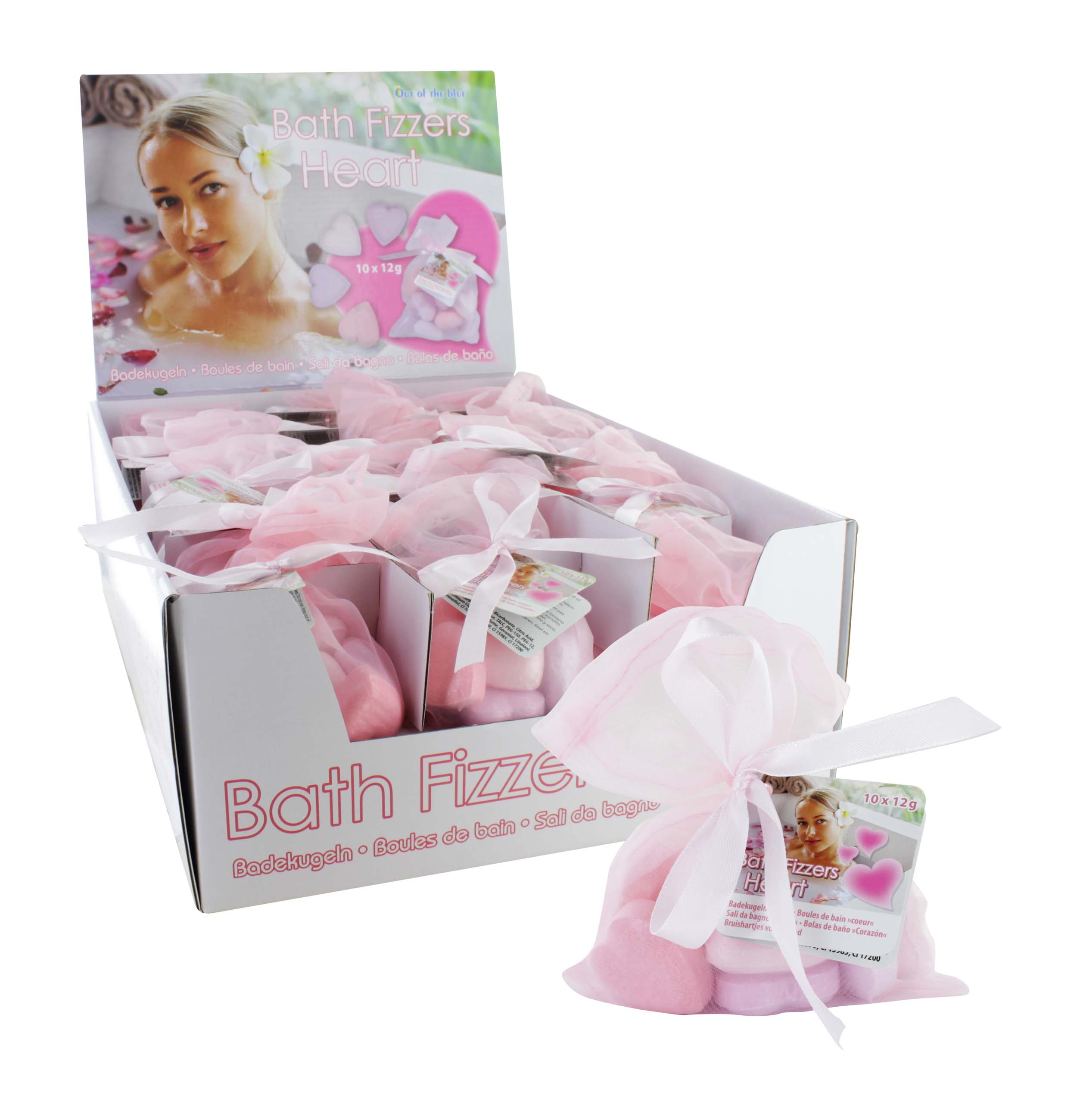 Heart-shaped fizzy bath treats displayed in a convenient pack.