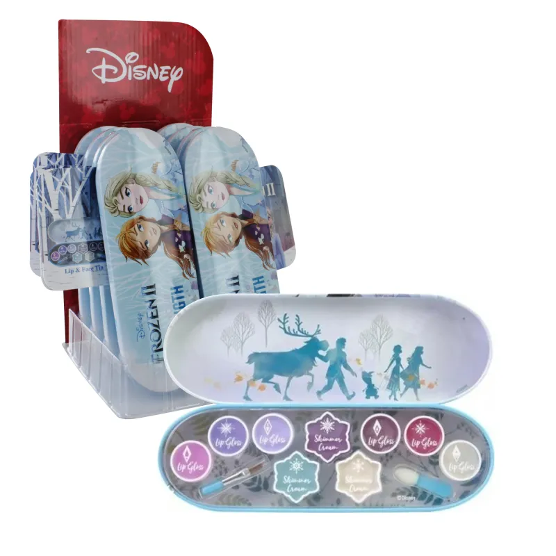 A sparkling palette featuring fun Frozen-inspired shades for lips and cheeks, perfect for creative play or festive looks.