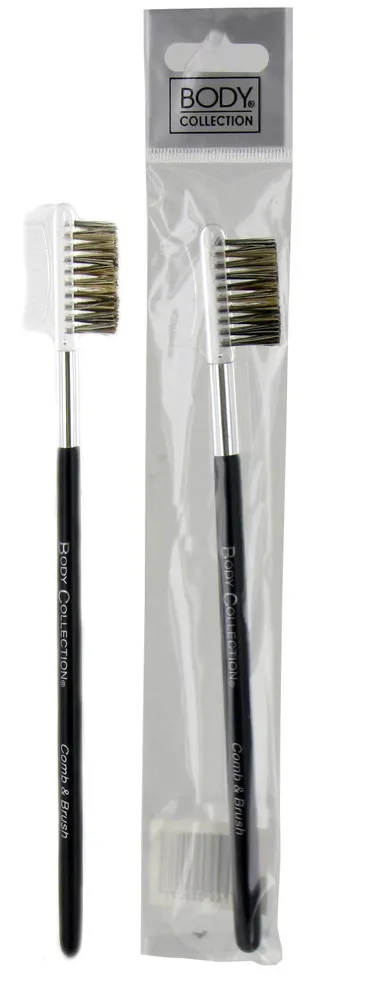 Dual-ended eye comb and brush for shaping brows and separating lashes.