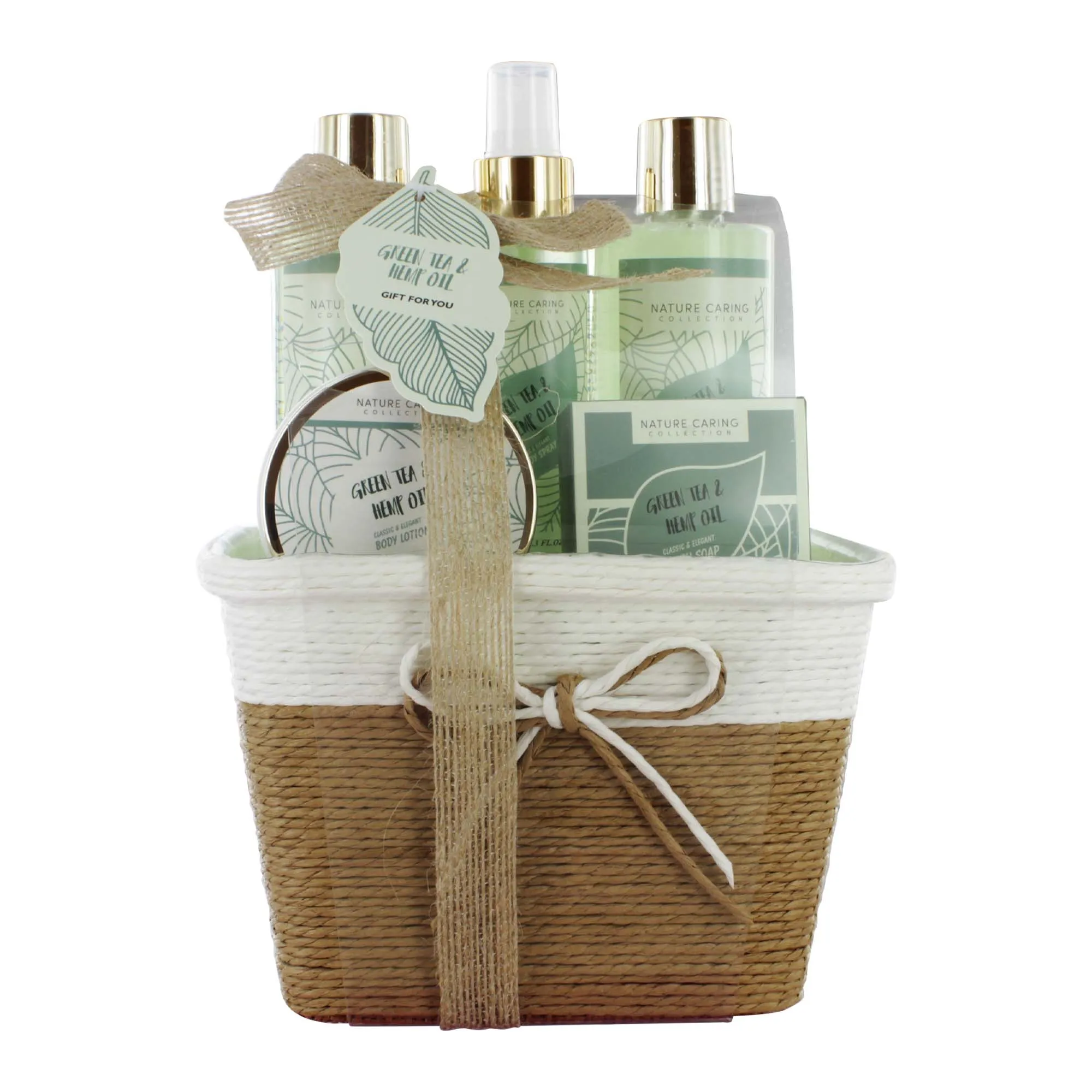 Six-piece basket gift set with Green Tea & Hemp Oil infused body care products.