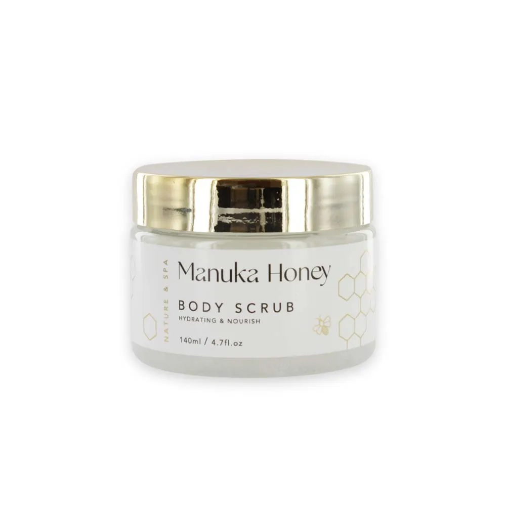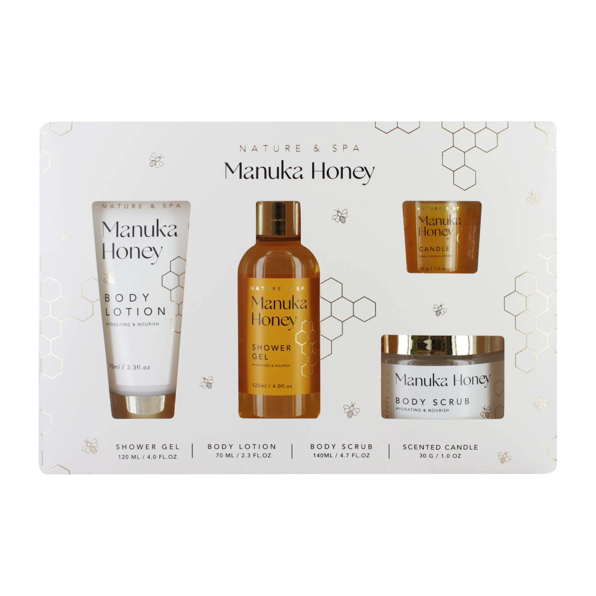 Four-piece gift set featuring Manuka Honey-infused bath and body care products.