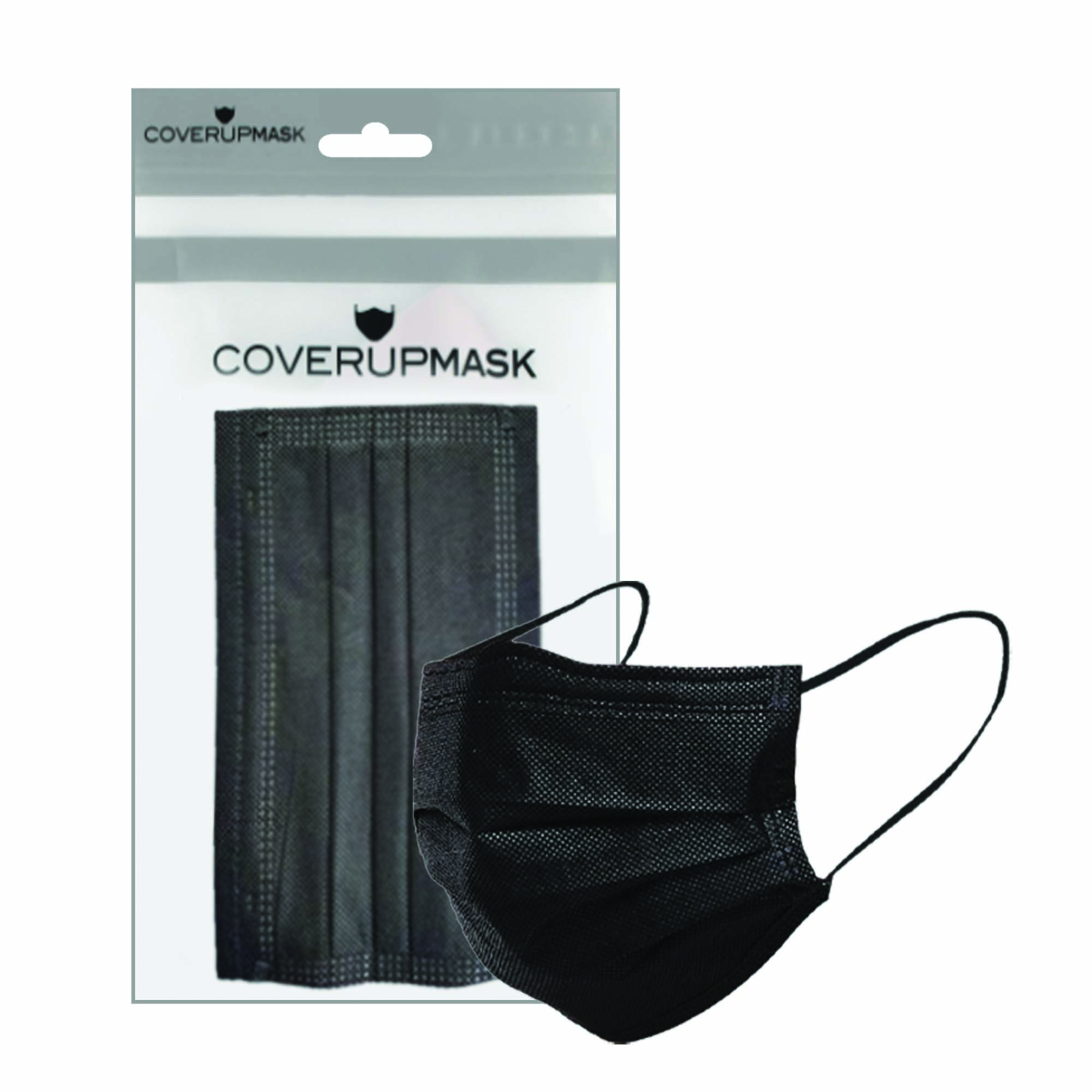 Compact pack of 10 disposable black 3-ply masks.