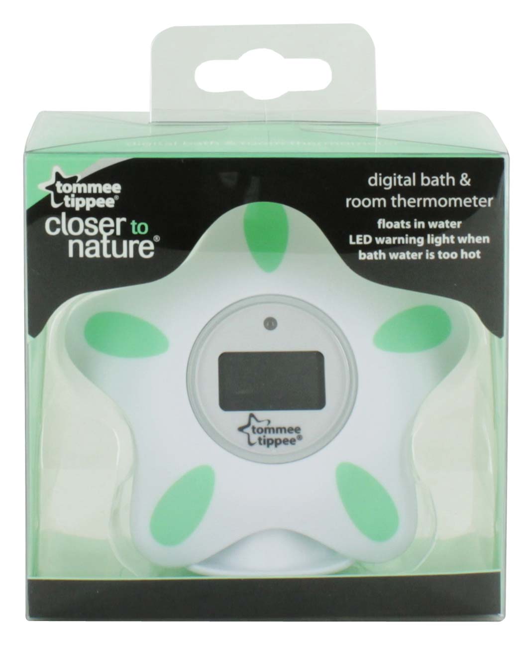 Dual-purpose thermometer to monitor bath water and nursery room temperature.