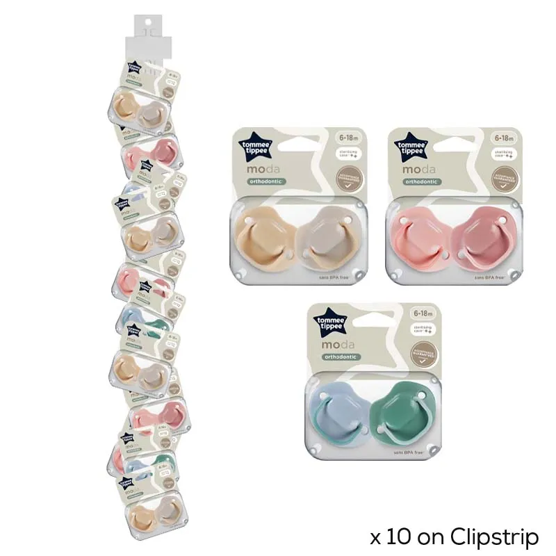 Orthodontic soothers designed for babies aged 6–18 months to support natural oral development. Supplied on a clip strip of 10, ideal for retail display and everyday soothing comfort.