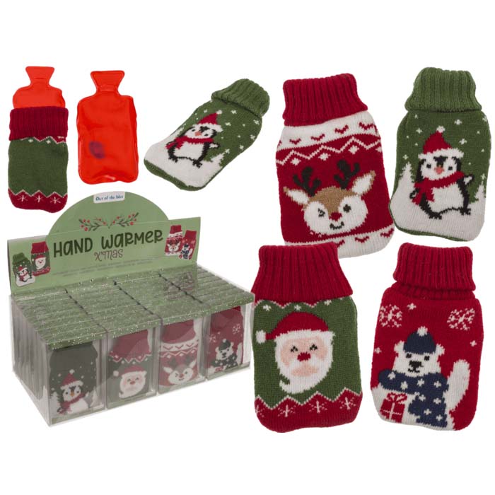 Display of Christmas hand warmers with knitted covers.