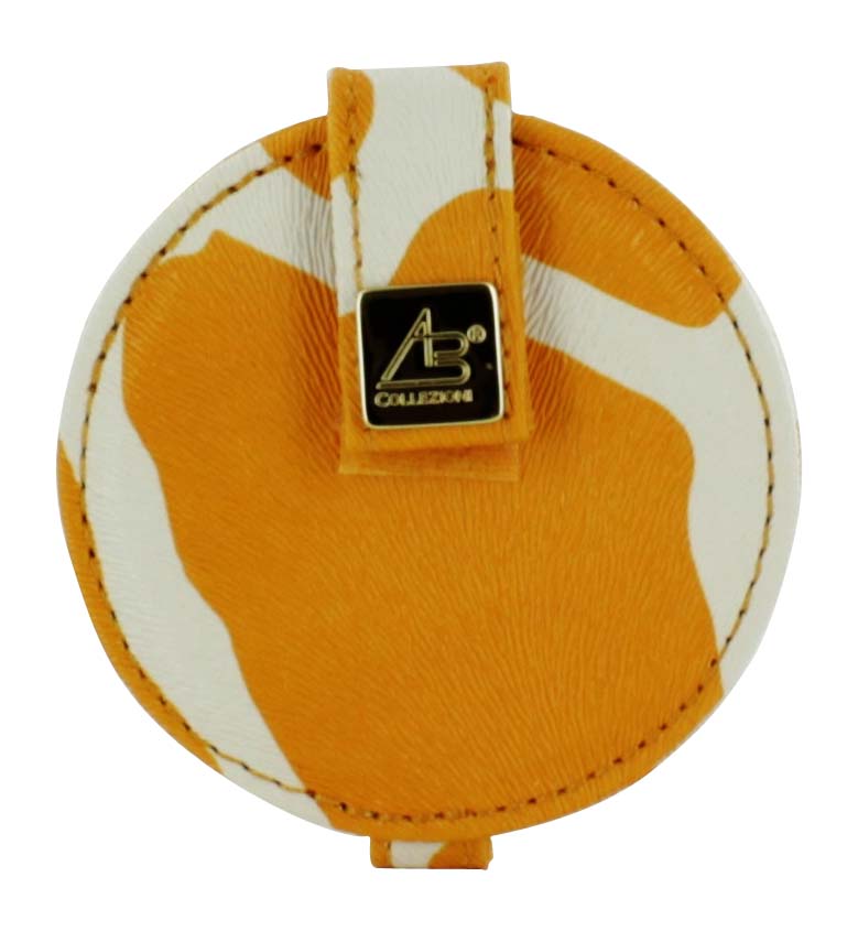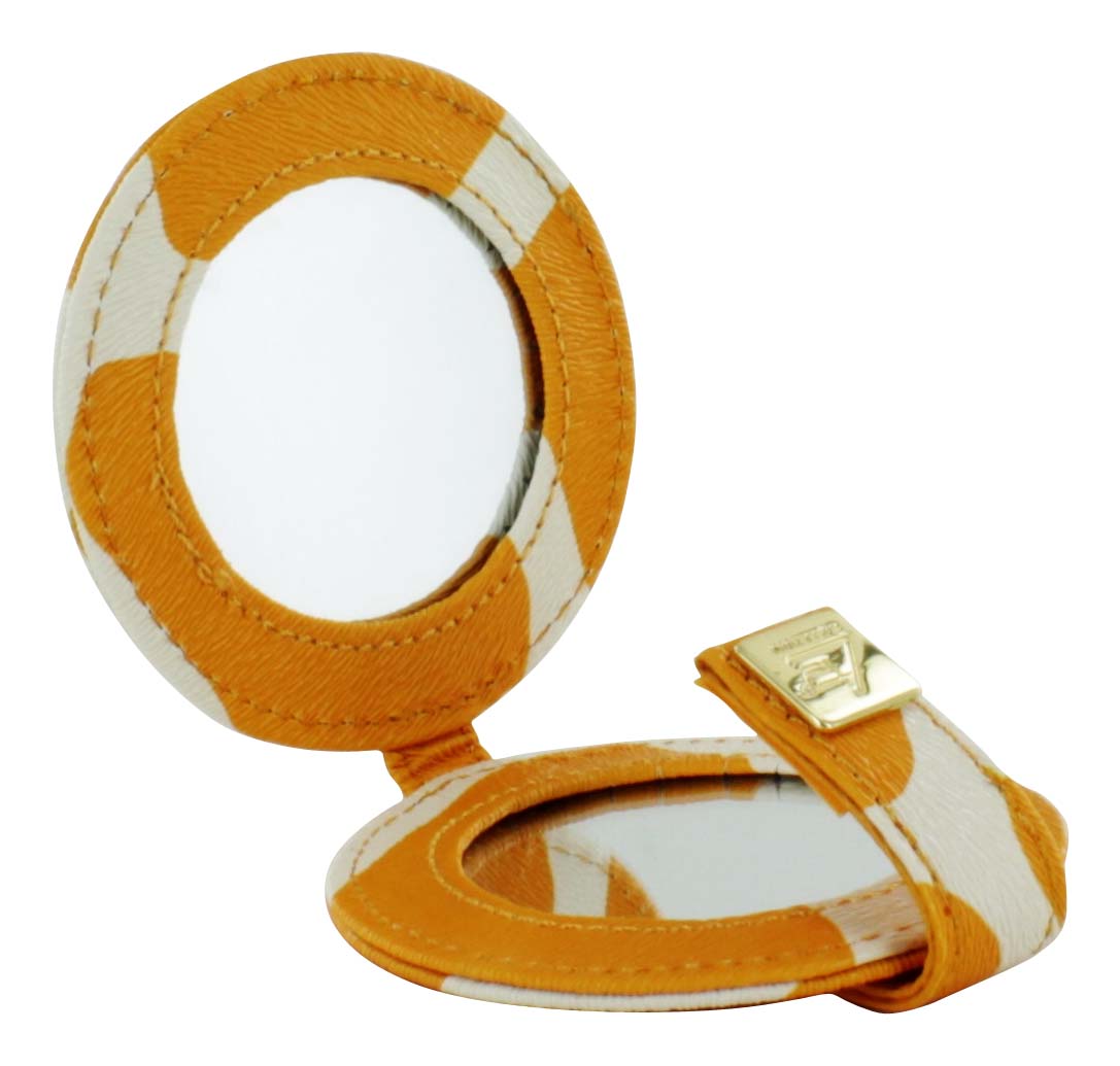 Compact mirror with yellow stripe design, ideal for makeup touch-ups.