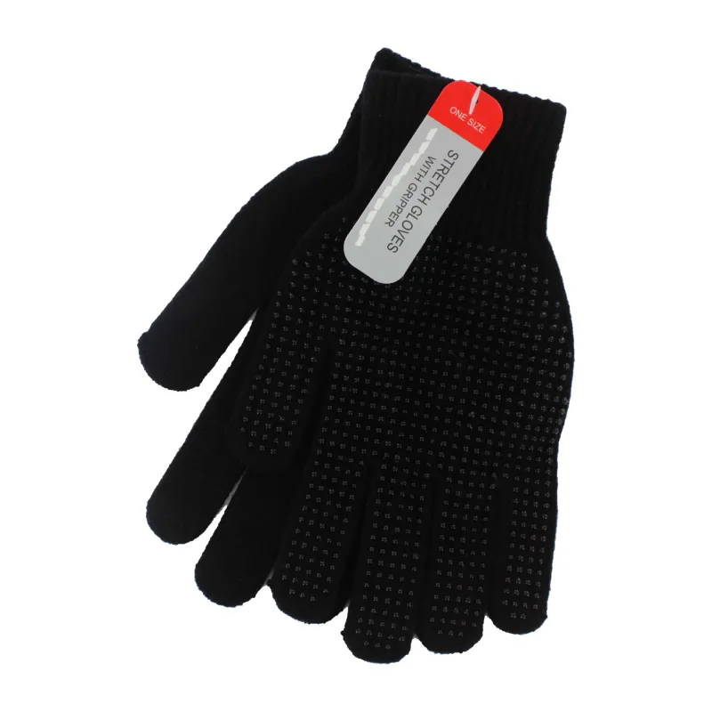 A pair of warm, flexible stretch gloves featuring non-slip gripper dots for secure handling and everyday comfort.