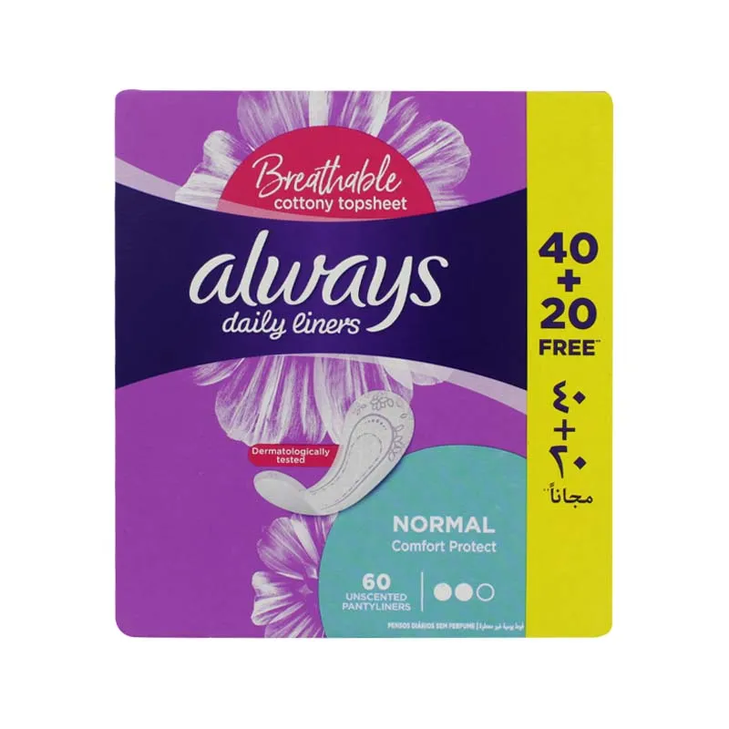 Stay fresh every day with Always Dailies Comfort Liners Normal (60 Pack). Soft, breathable, and flexible, these liners provide all-day comfort and reliable protection for daily freshness.