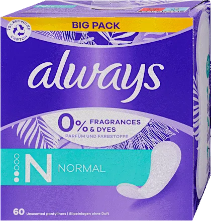 A pack of 60 individually wrapped panty liners providing daily freshness and protection, made with 0% perfume for sensitive skin comfort.