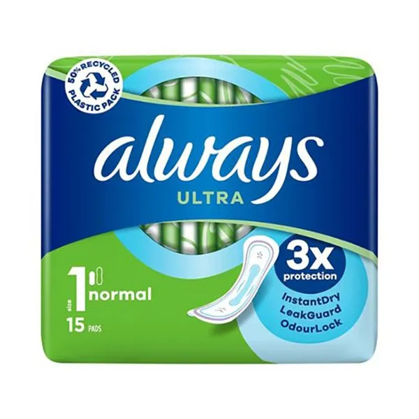 Pack of 15 normal sanitary pads with instant dry technology for comfort and protection.