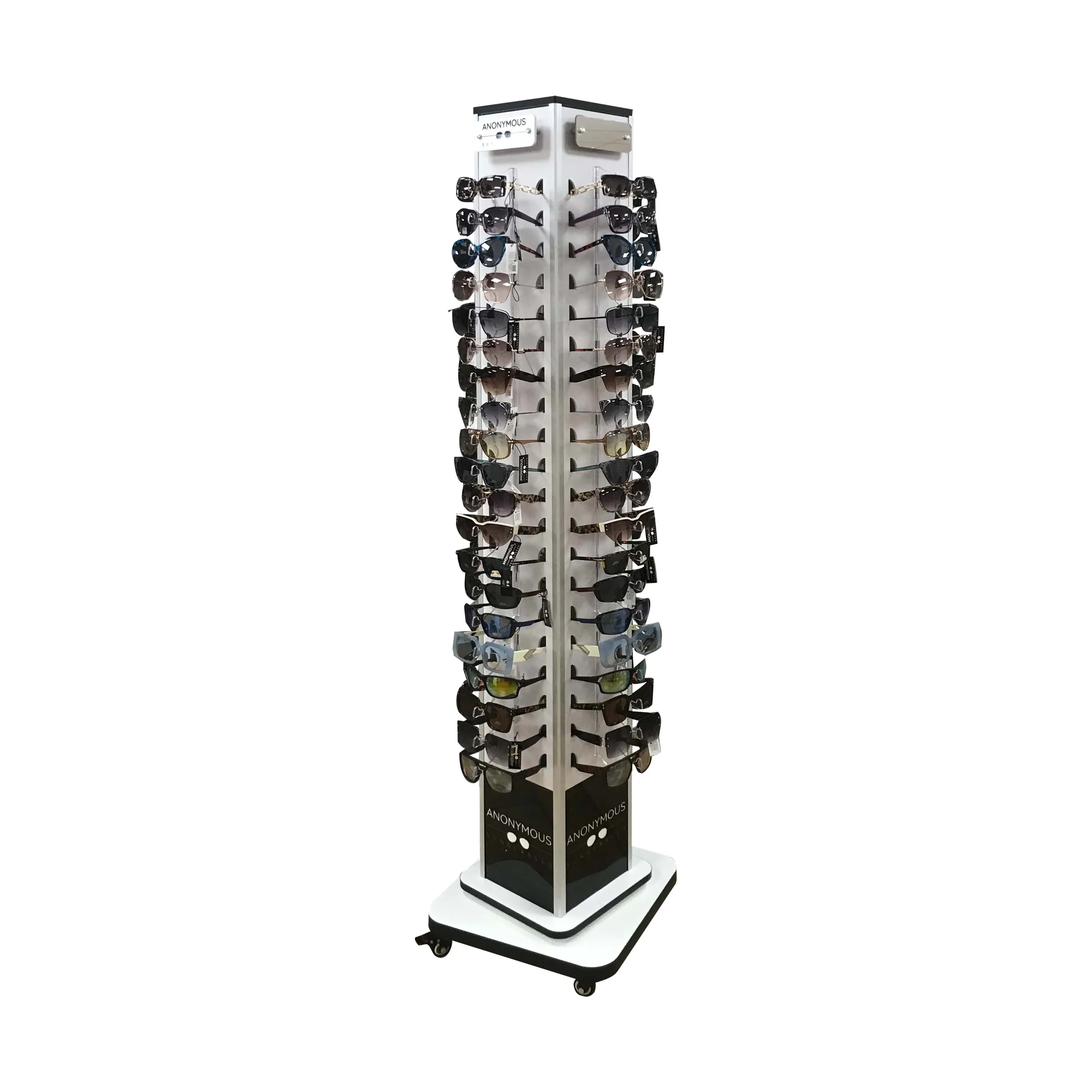 A free-standing display unit containing 120 assorted anonymous sunglasses. Ideal for retail environments, offering a variety of fashionable styles for everyday wear and impulse purchases.