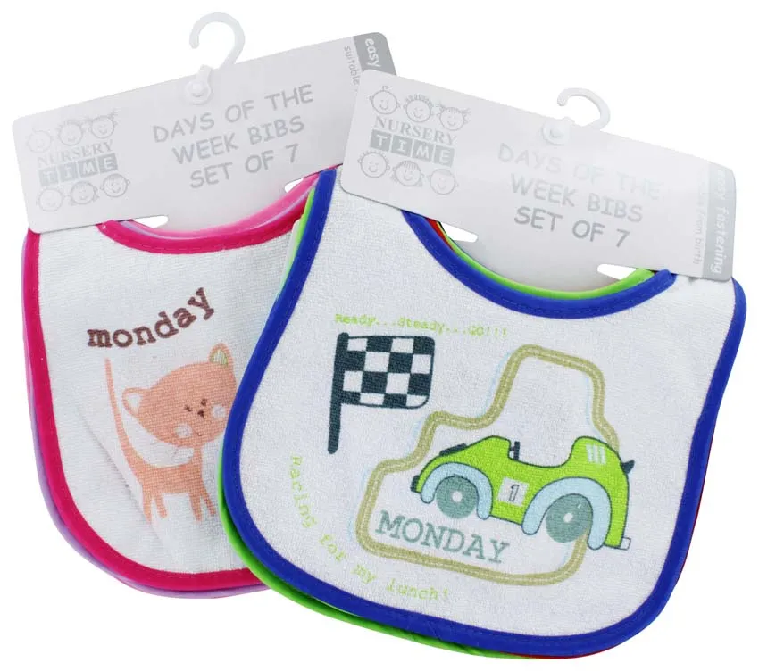 Seven-pack of velcro-fastening bibs for everyday feeding use.
