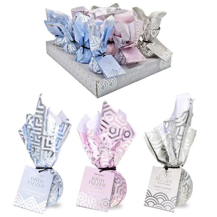 Assorted fizzy bath bombs in a silver-themed display pack.