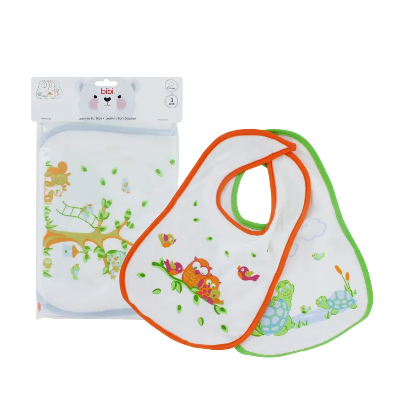 Pack of three soft Velcro baby bibs designed for easy feeding and mess control.