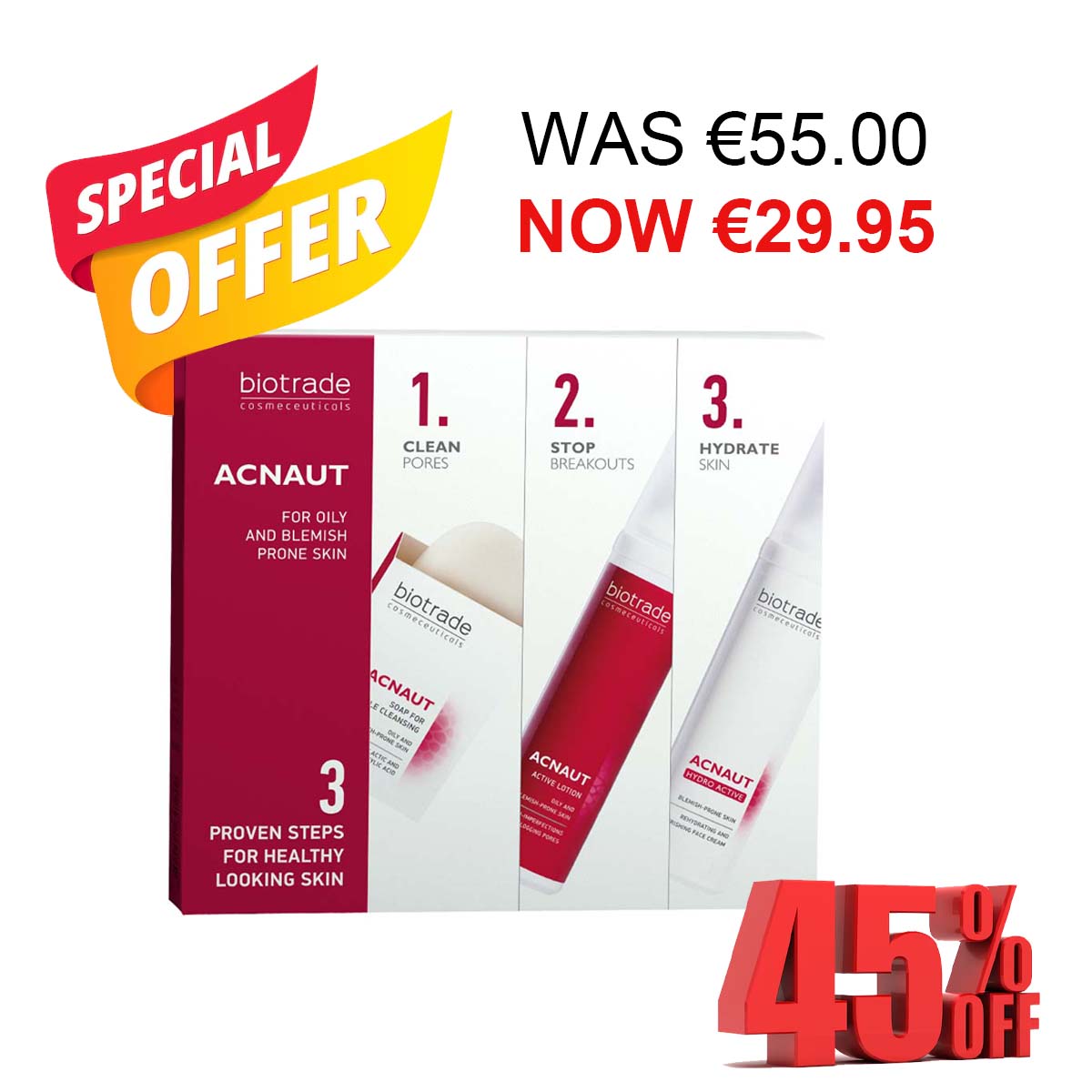 A targeted skincare kit designed to tackle blemishes and prevent future breakouts. Includes three steps for cleansing, treating, and protecting skin for a clearer complexion.