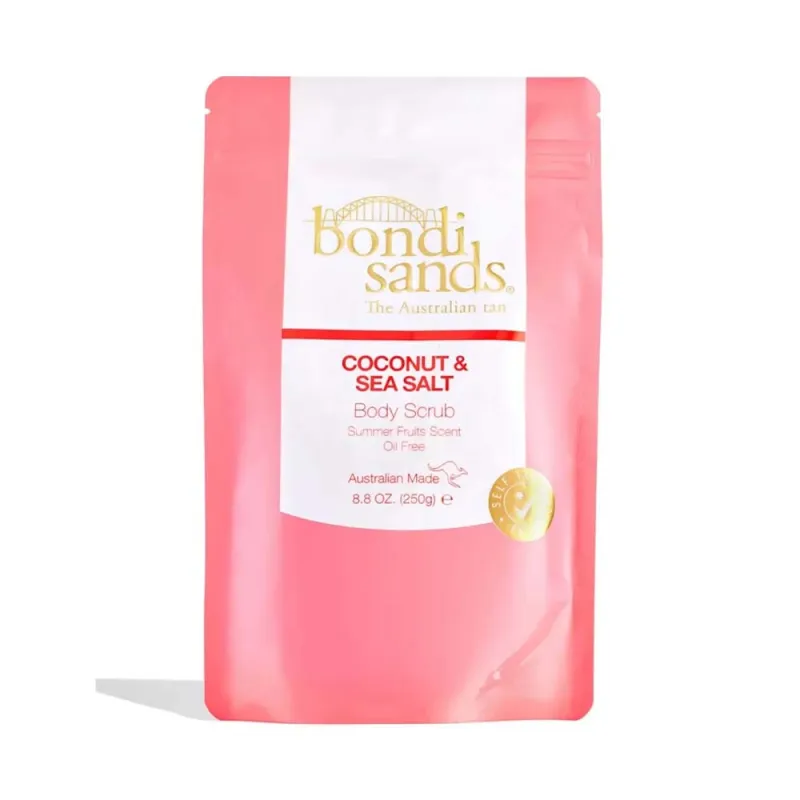 Exfoliating body scrub with coconut, sea salt, and summer fruit fragrance to smooth and refresh skin.