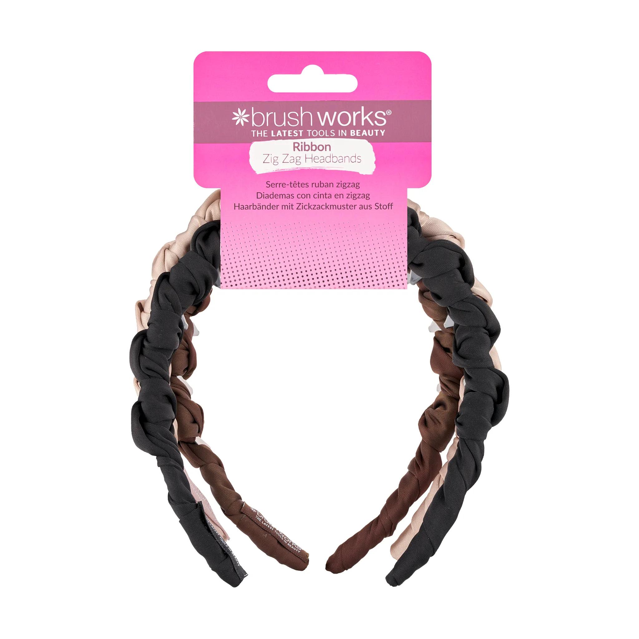 A 3-pack of ribbon-wrapped zig-zag headbands designed to keep hair securely in place while adding a soft, stylish finish. Featuring a classic zig-zag grip and smooth ribbon coating, they provide a comfortable hold without snagging or pulling.