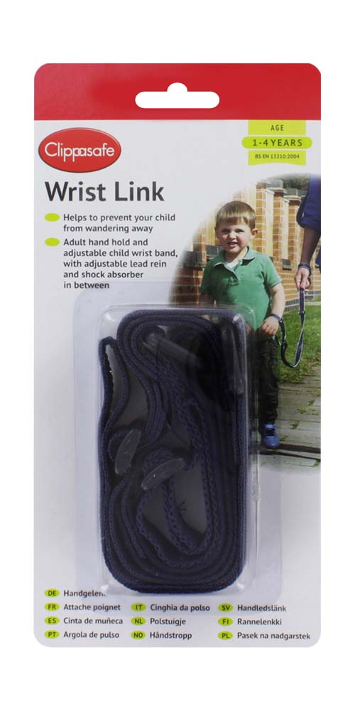 Navy wrist link to help keep toddlers close and safe outdoors.