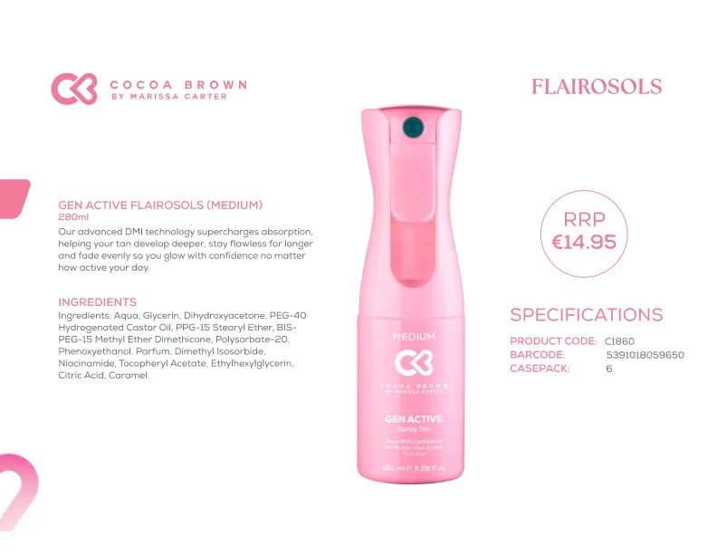 Cocoa Brown Gen Active Flairosols in Medium is an ultra-fine spray tan powered by advanced DMI technology to enhance absorption for deeper development, longer wear and an even fade. The continuous mist delivers seamless, streak-free coverage, while Niacinamide and Vitamin E help support smooth, radiant-looking skin.