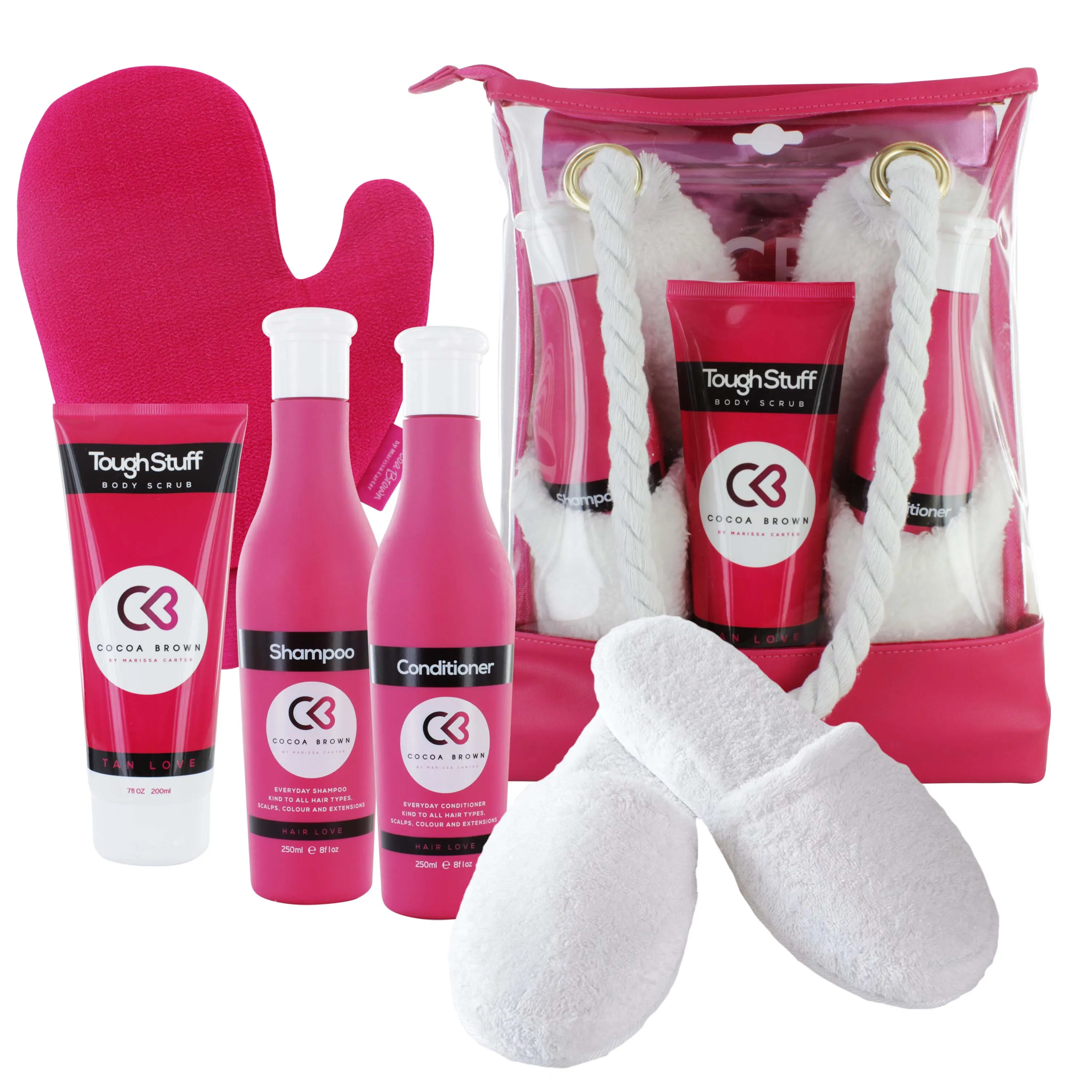 Luxury gift set featuring cozy slippers paired with Cocoa Brown tanning essentials.