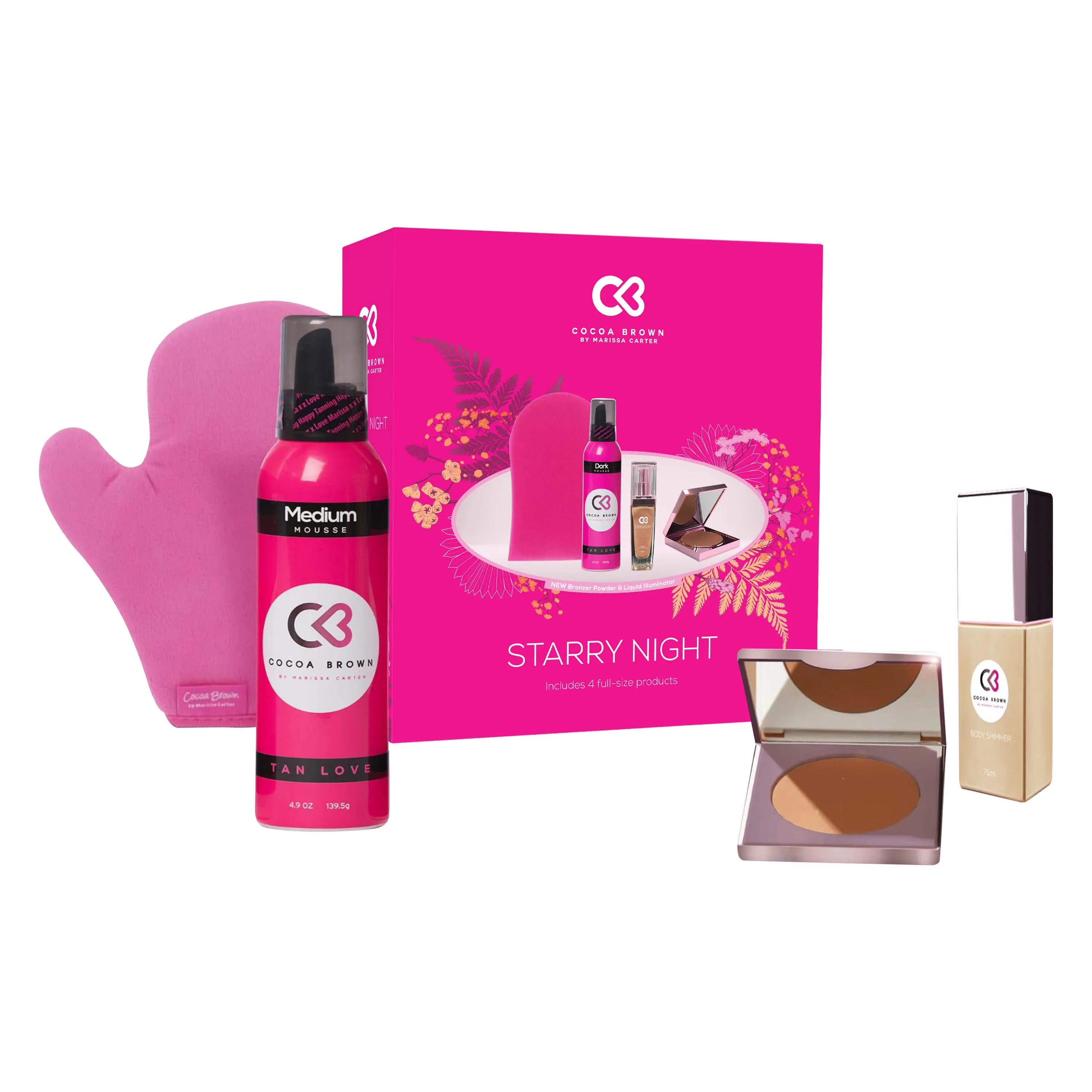 Limited edition beauty set with Cocoa Brown tanning favorites for a radiant glow.