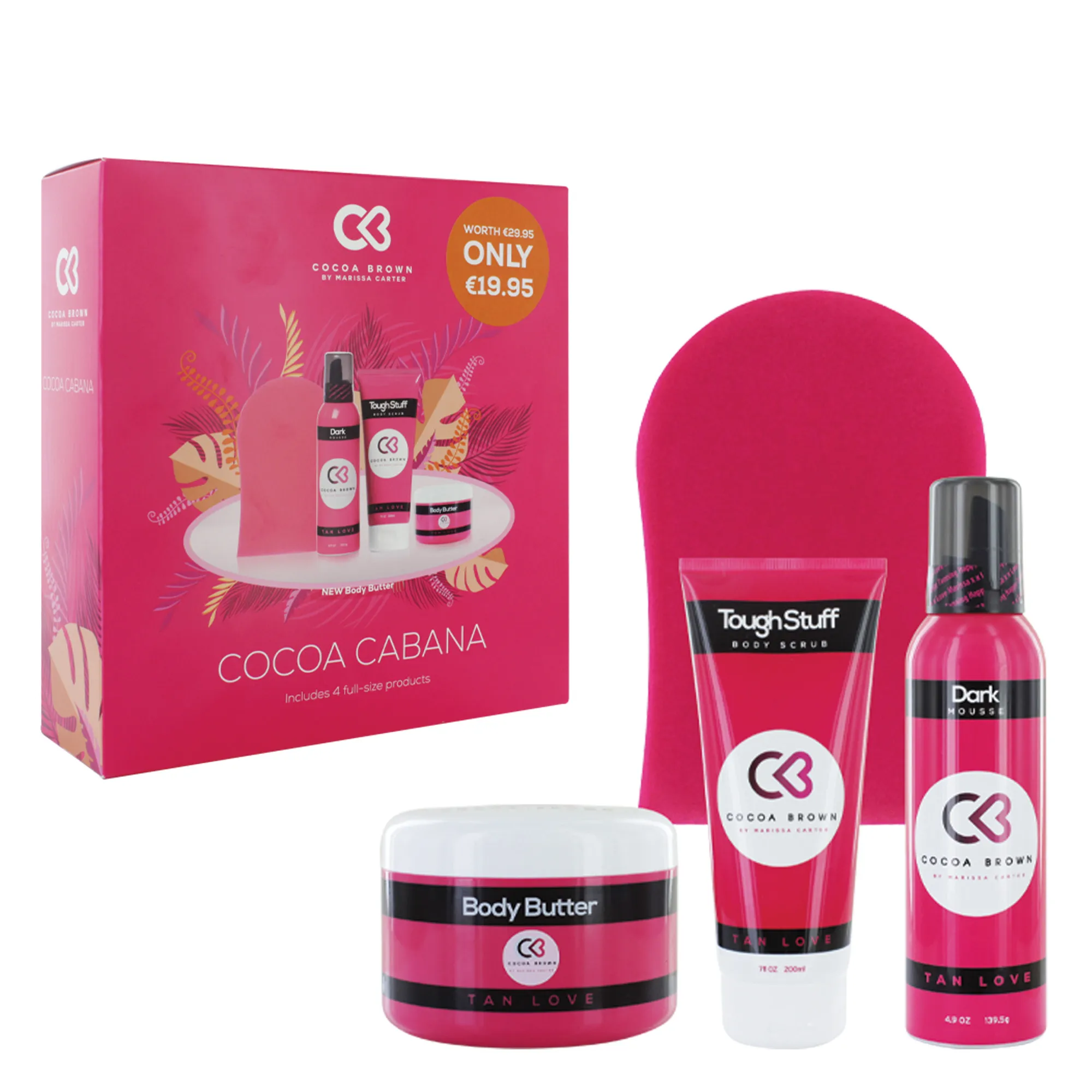 Tropical inspired beauty set featuring Cocoa Brown tanning and glow essentials.