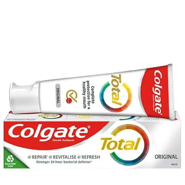 Colgate Total Original Toothpaste 75ml provides comprehensive daily oral care with cavity protection, plaque removal, and long-lasting fresh breath. Its trusted formula helps maintain healthy teeth and gums while ensuring a clean, refreshed feeling after every brush.