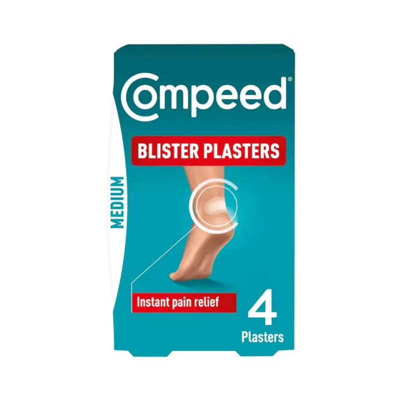 Compeed Medium Blister Plaster 4 Pack (x6) provides effective cushioning and protection for blisters, helping relieve pain and promote faster healing. The hydrocolloid technology absorbs moisture and forms a protective layer, making it ideal for feet, heels, and other blister-prone areas.