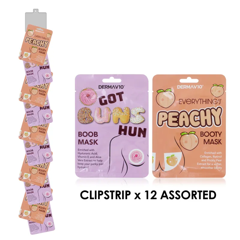 Fun and nourishing sheet masks for targeted skin care, featuring peach and hydrating formulas to pamper the booty and bust areas.