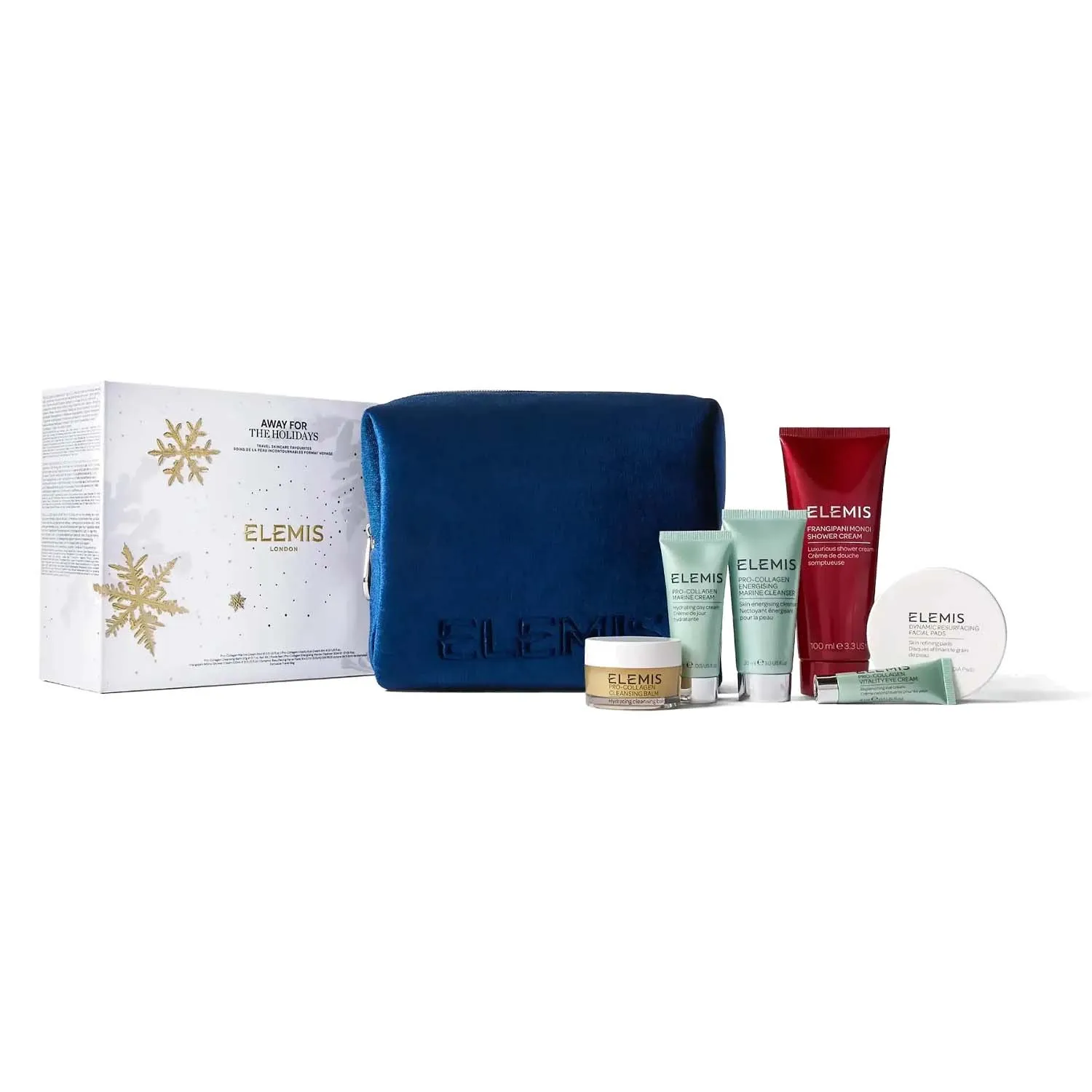 A premium Elemis “Away for the Holidays” gift bag set featuring a curated selection of travel-sized skincare essentials designed for cleansing, hydration, and anti-ageing. Ideal for gifting or travel, this set delivers a complete skincare routine in one compact collection.