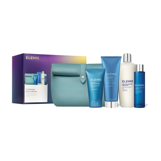 A premium 5-piece Elemis body care gift set designed to deliver a complete at-home spa experience focused on relaxation, muscle comfort, and skin nourishment. Presented in a branded cosmetic travel bag, it’s ideal for gifting or indulgent self-care.