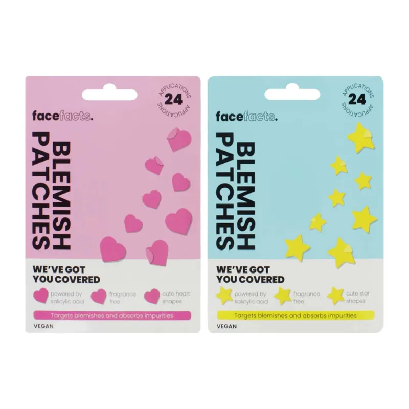 Hydrocolloid patches designed to target blemishes, featuring fun star and heart shapes for discrete acne care.
