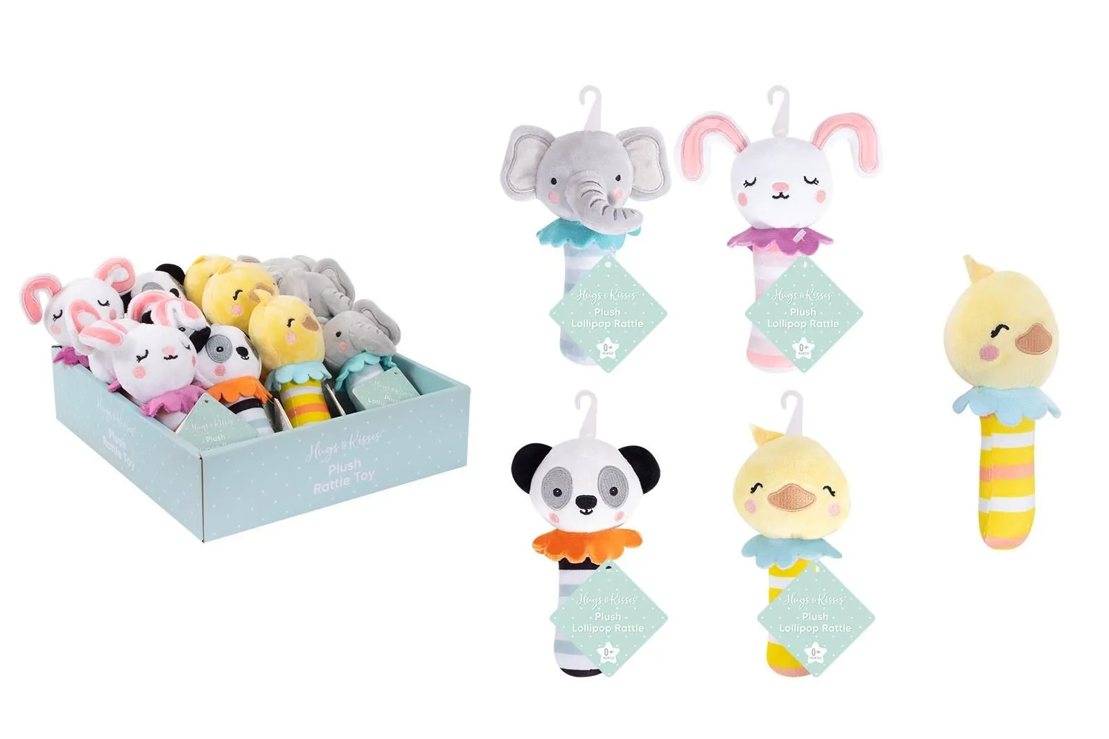 plush toys, each featuring a built in rattle for baby play and sensory development.