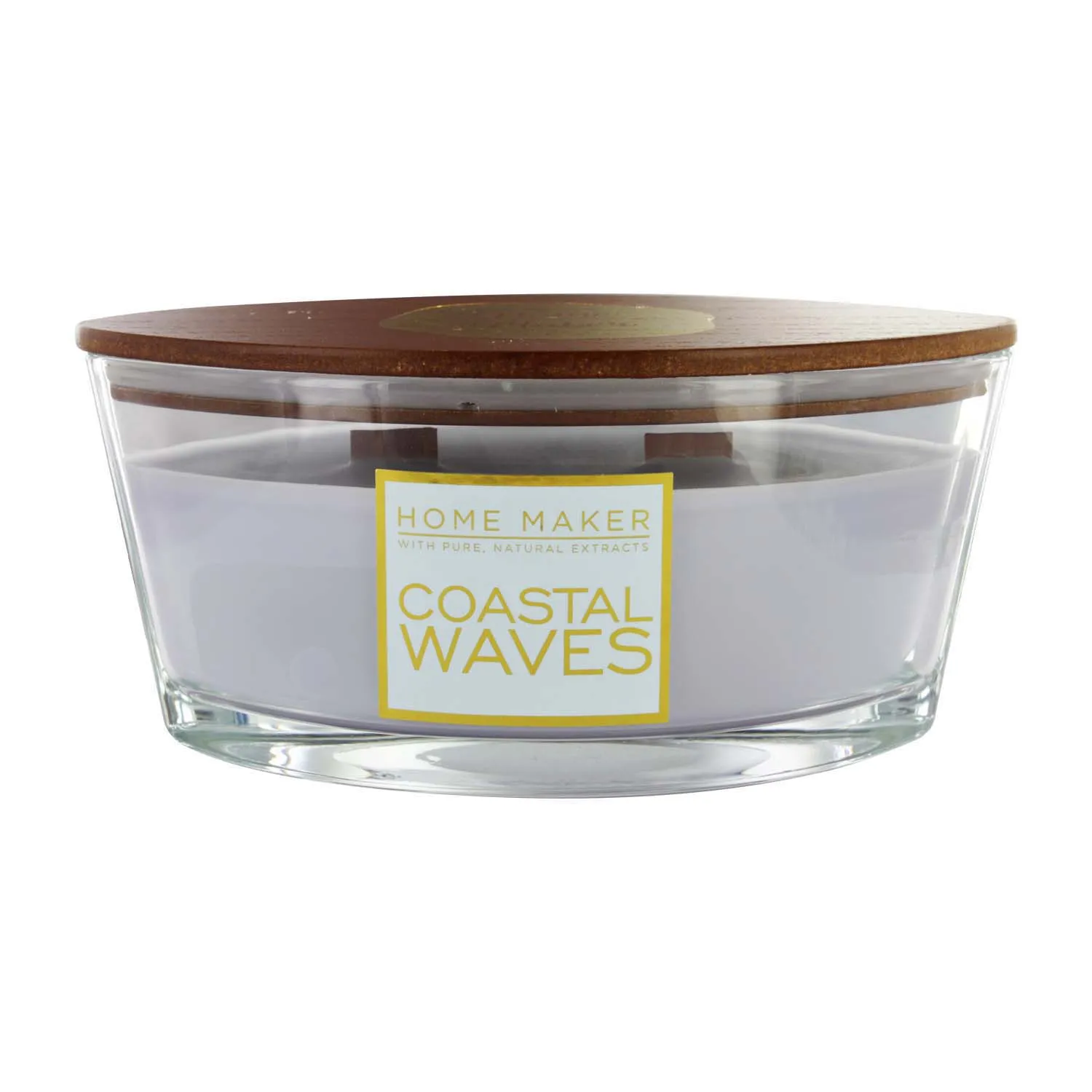 Large wood wick candle with a Coastal Waves scent, creating a relaxing seaside-inspired atmosphere.