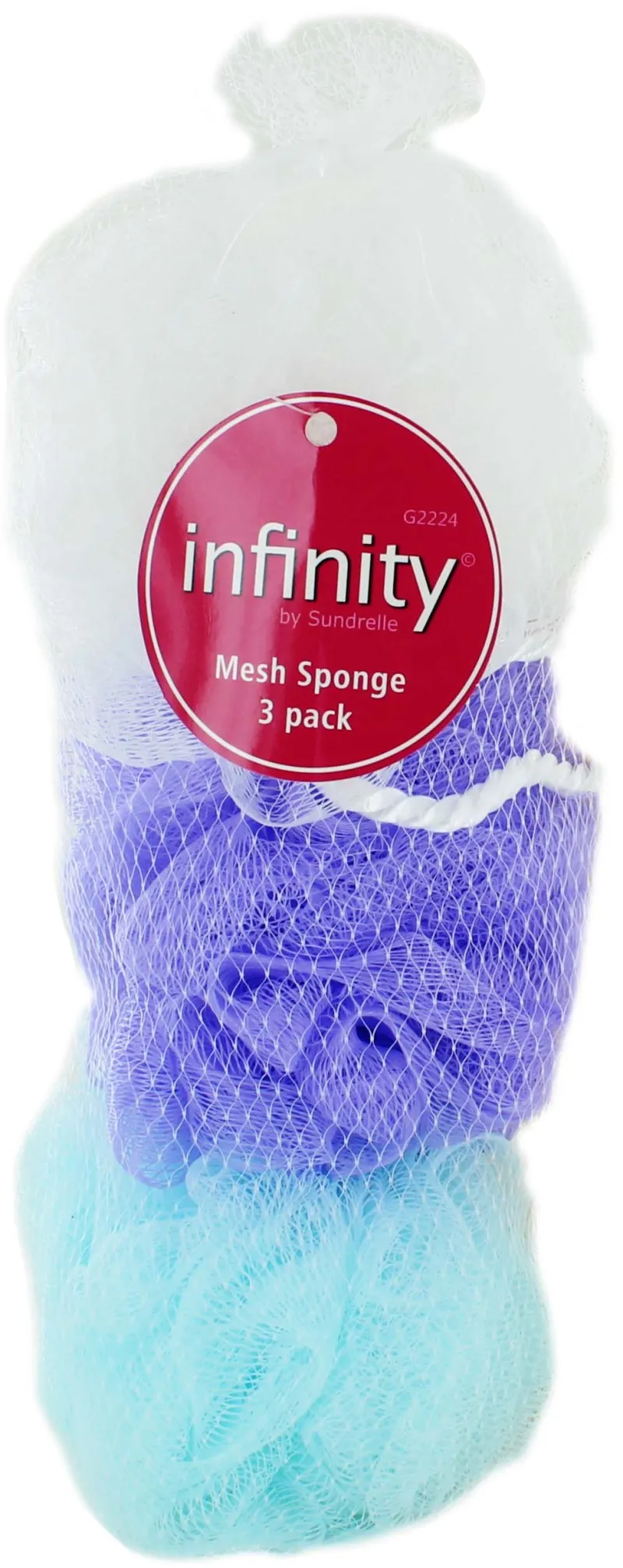 Triple pack of mesh shower sponges for effective lather and cleansing.