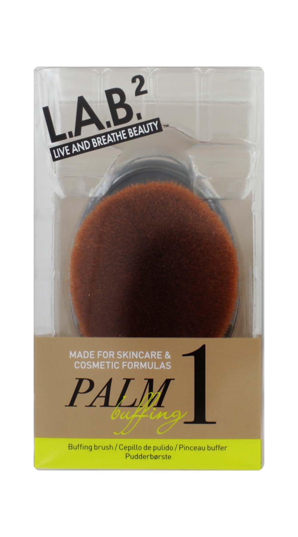 Palm-sized buffing brush for flawless blending of foundation and powders.