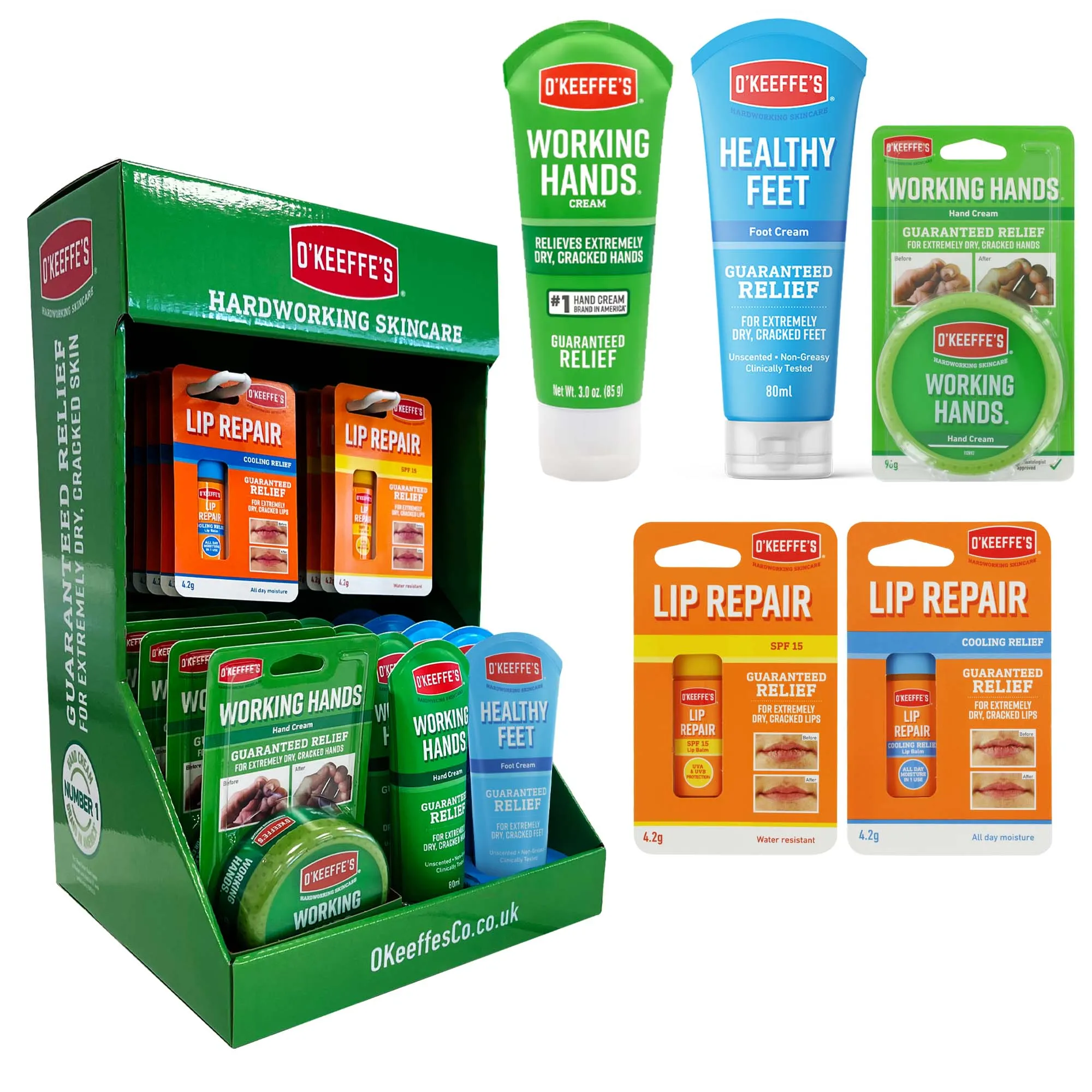 A compact counter display featuring O’Keeffe’s high-performance skincare essentials for extremely dry skin. Ideal for retail checkout areas, showcasing trusted hand and body care solutions.