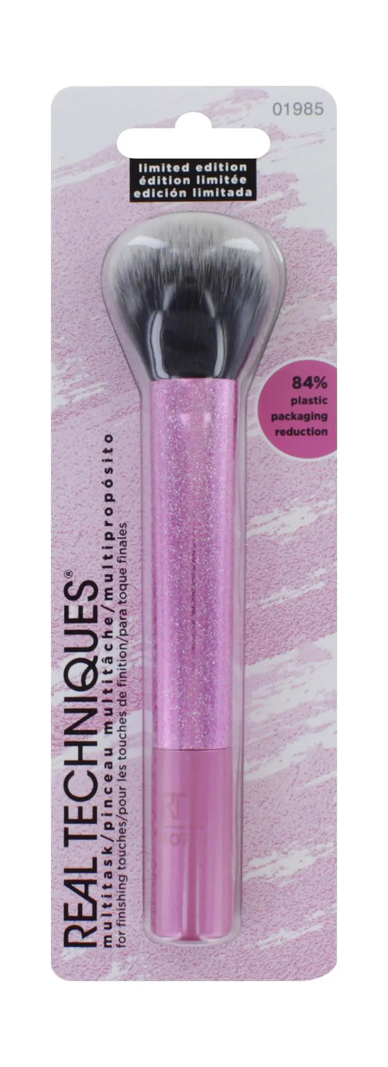 Versatile brush for applying foundation, blush, bronzer, and powder.