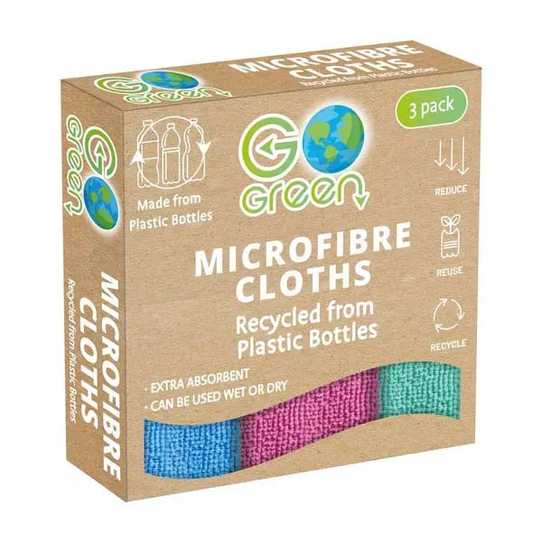 A pack of three eco-friendly microfibre cloths made from recycled materials, ideal for effective cleaning without harsh chemicals. Soft, durable, and highly absorbent, perfect for use on a variety of surfaces.