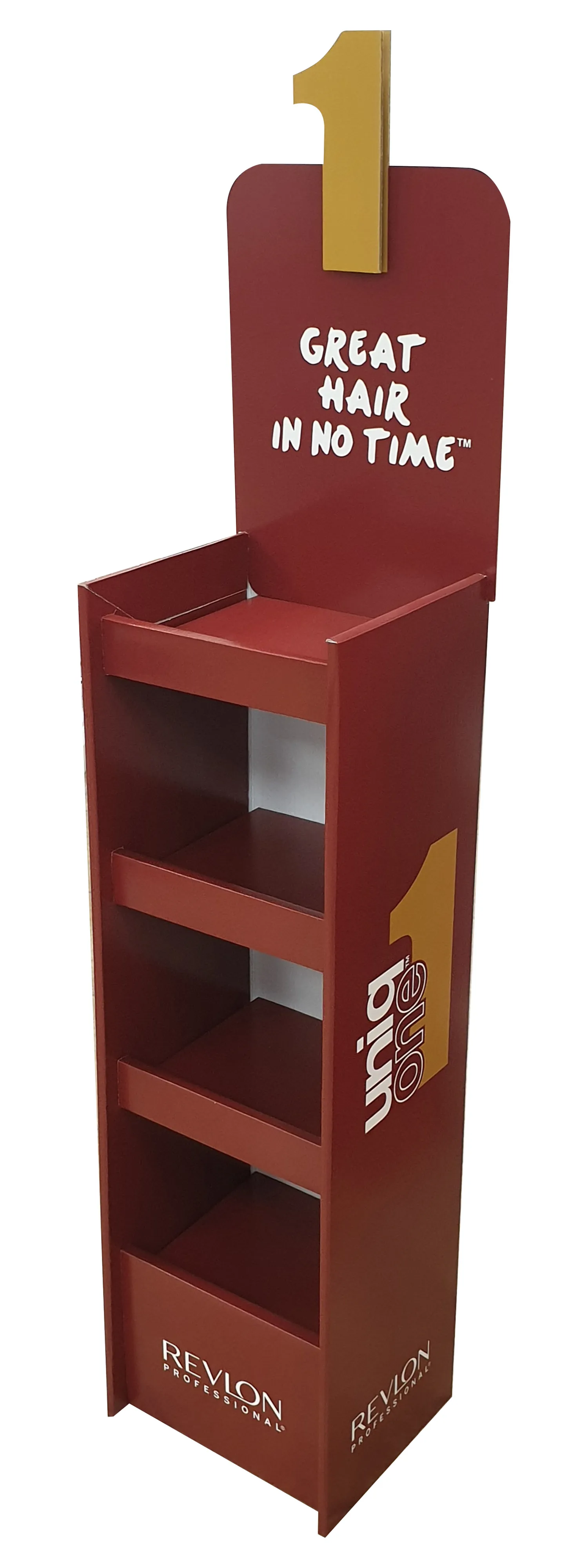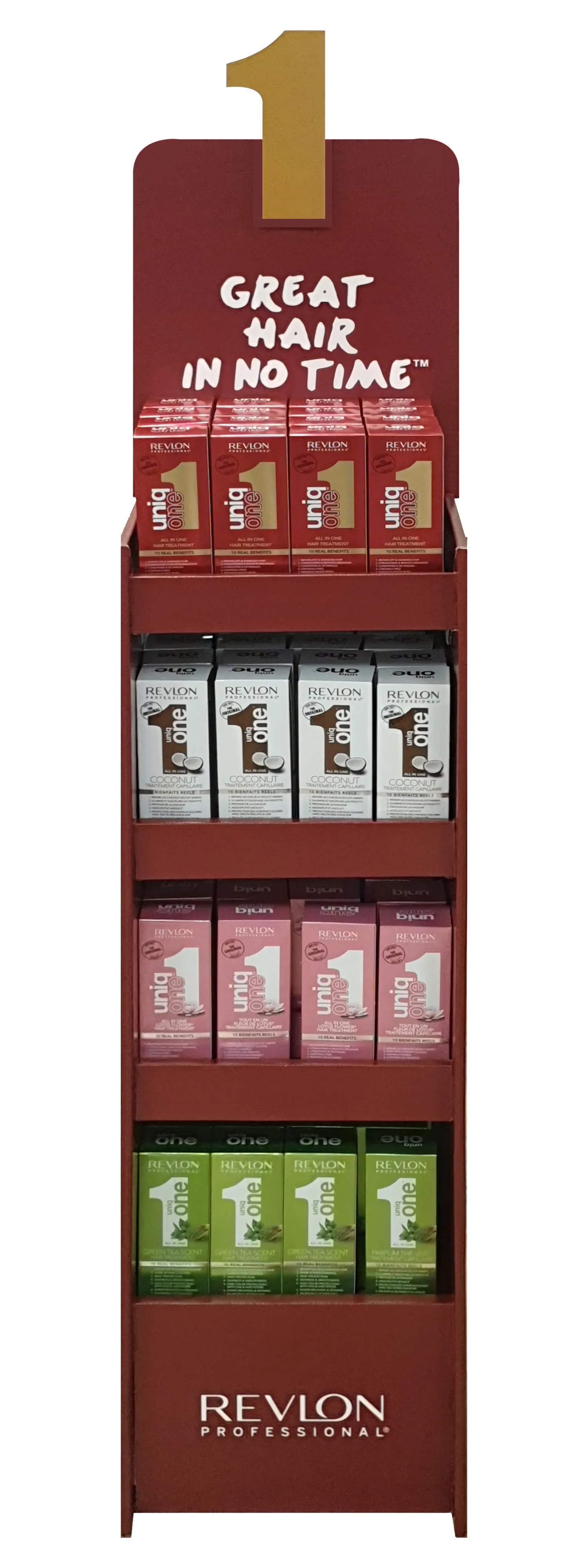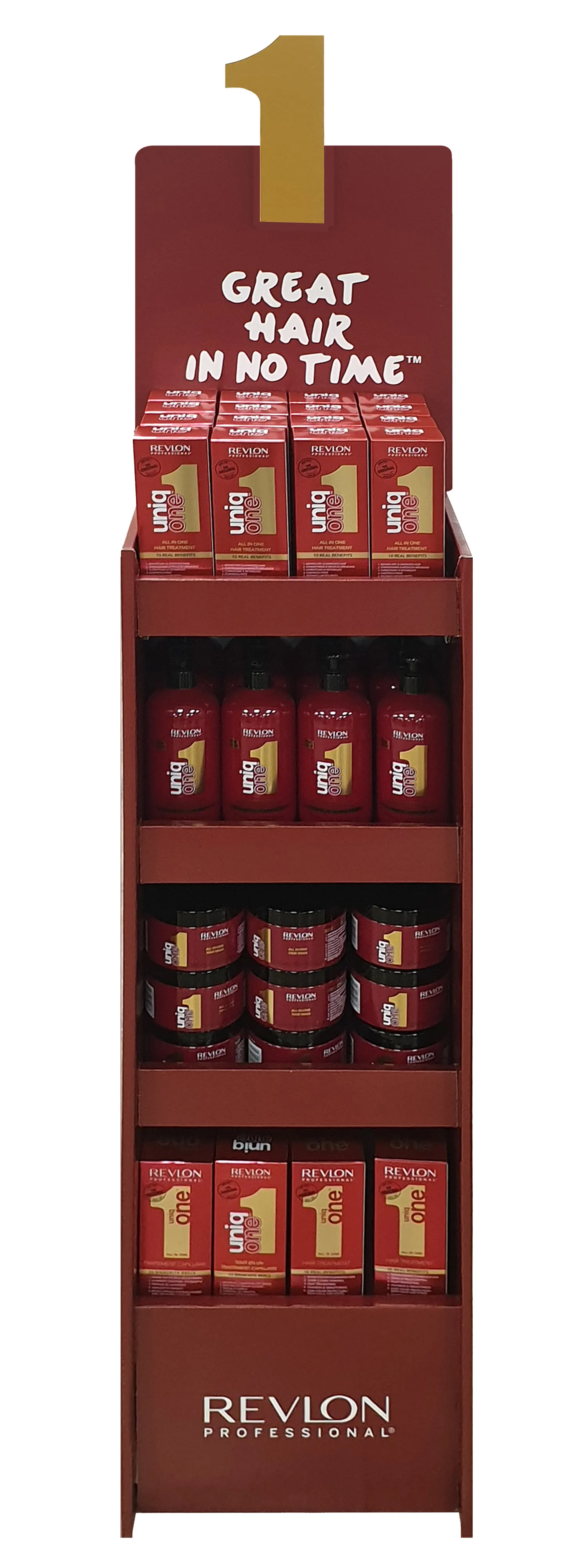 Revlon Uniq One FSDU Empty is a free-standing display unit for pharmacy retail. Supplied empty, it is designed to be filled with the Revlon Uniq One range.