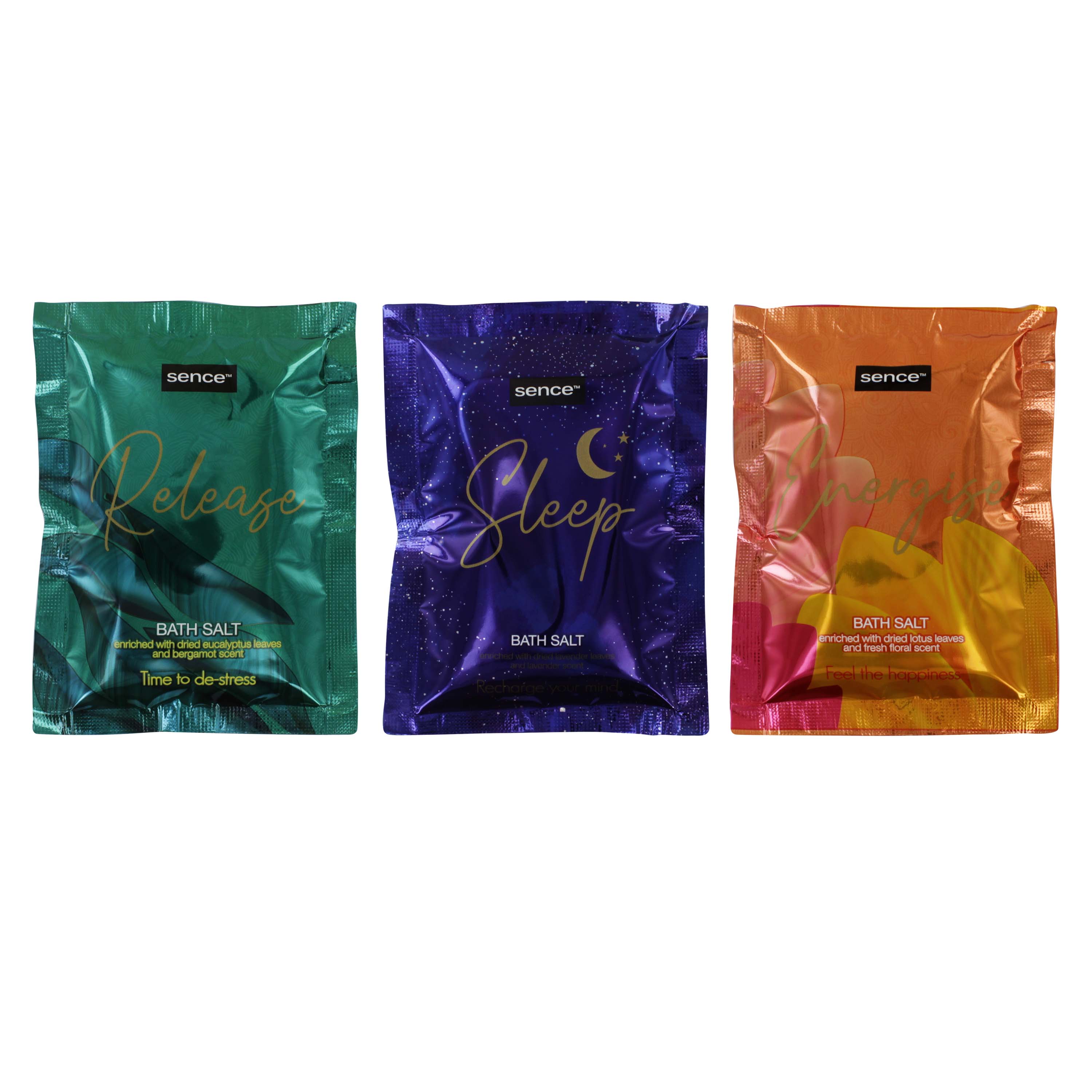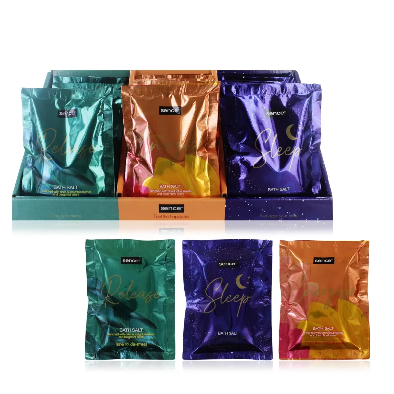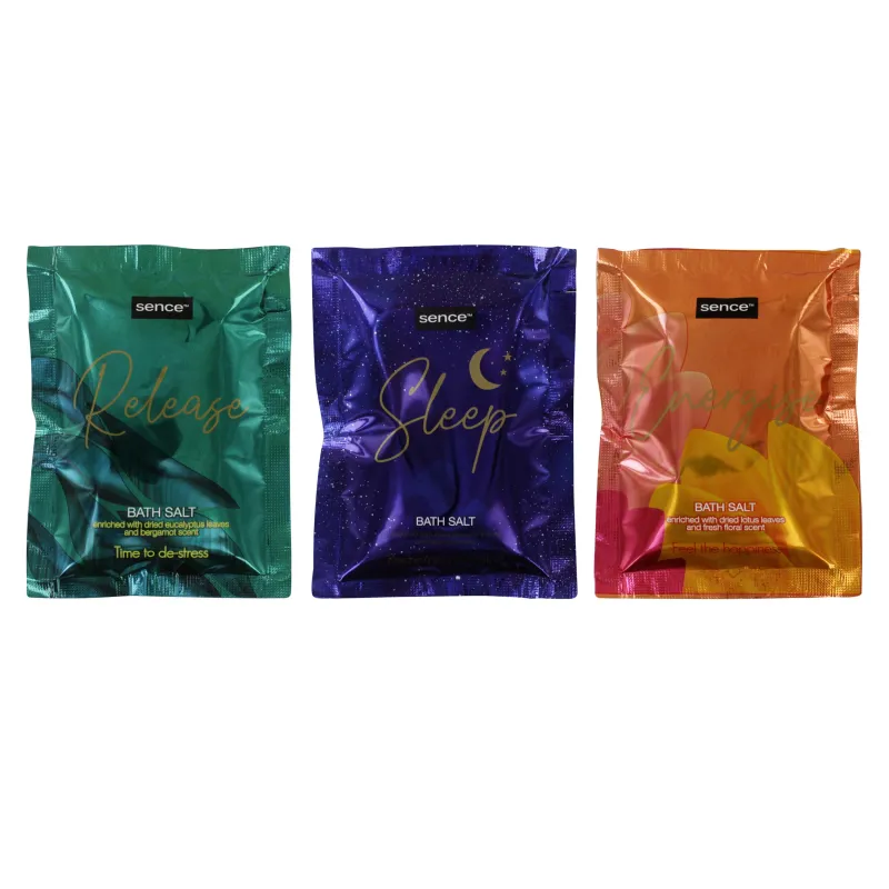 Single-use packs of relaxing bath salts for wellness routines.