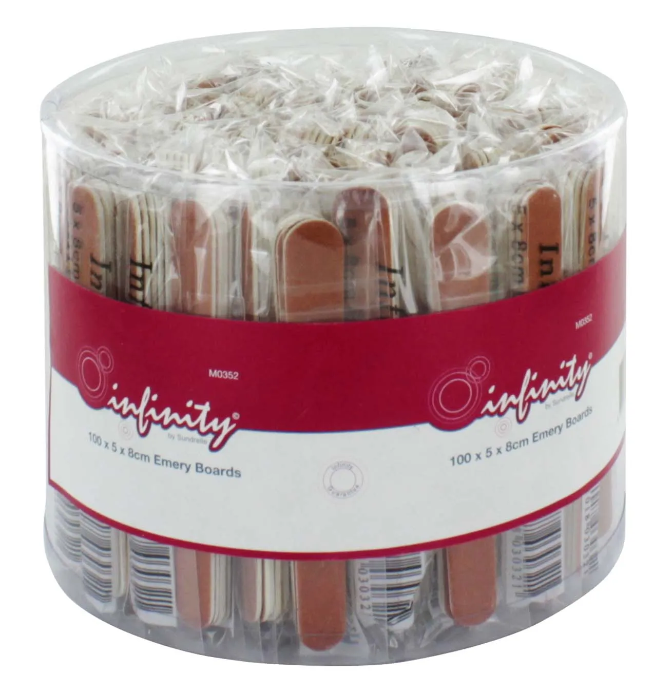 A tub containing 100 small emery boards, perfect for shaping and smoothing nails at home or on the go.