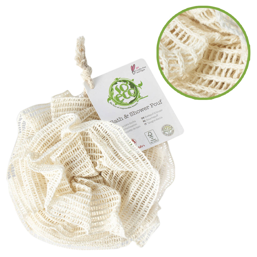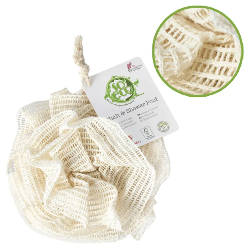 Eco friendly bamboo shower pouf for exfoliation and lather.