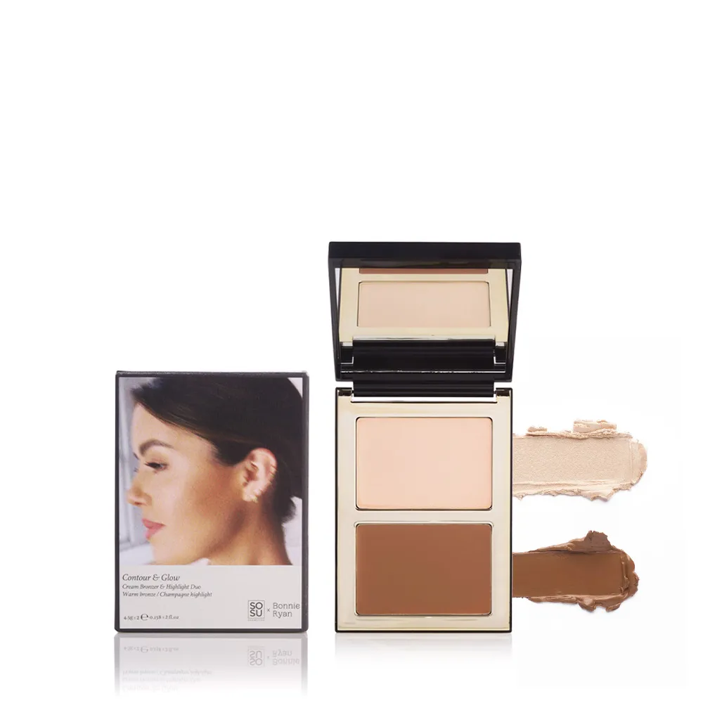 SOSU Cosmetics Bonnie Contour & Glow Duo is a 2-in-1 cream palette designed to sculpt, define, and enhance your natural features. It includes a warm bronze contour shade and a champagne highlighter that work together to create depth and a radiant glow.