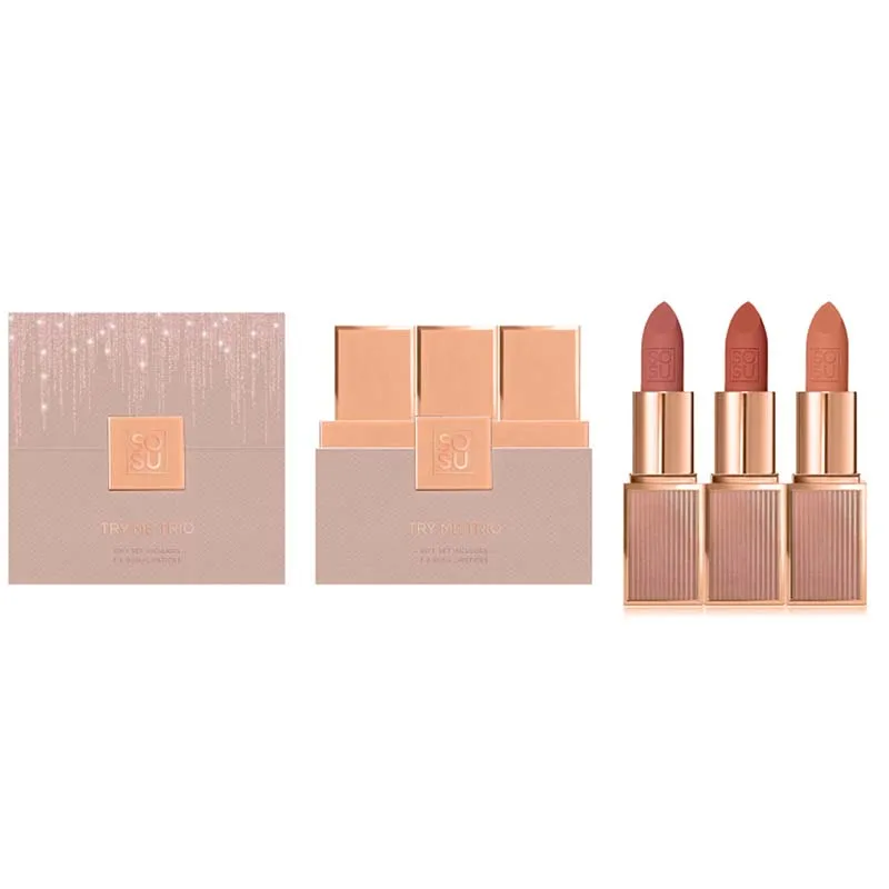 A gift set featuring three SOSU lipsticks in stunning, wearable shades. Perfect for gifting or elevating your everyday makeup routine.
