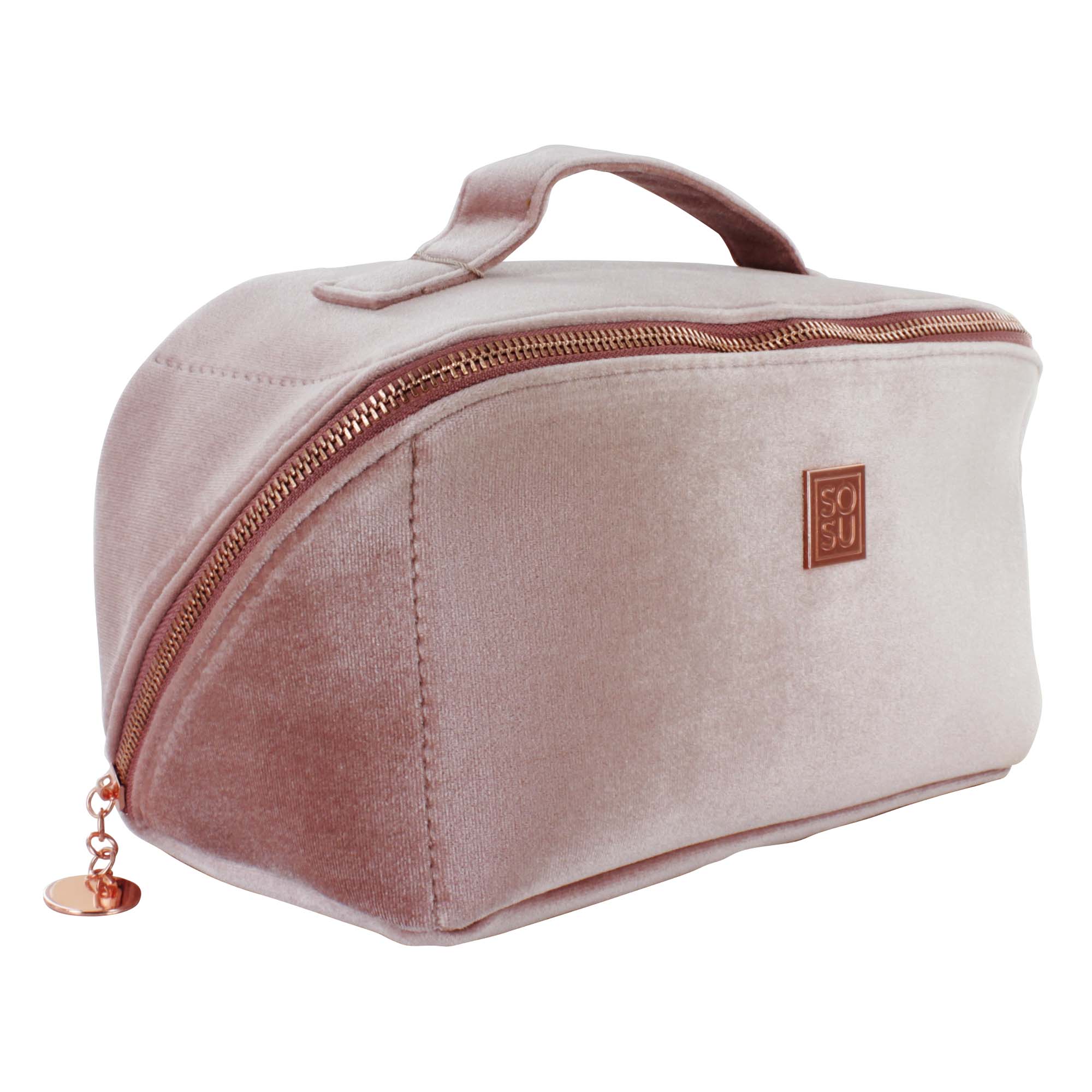 Soft pink velvet cosmetic bag offering a touch of luxury for makeup storage.