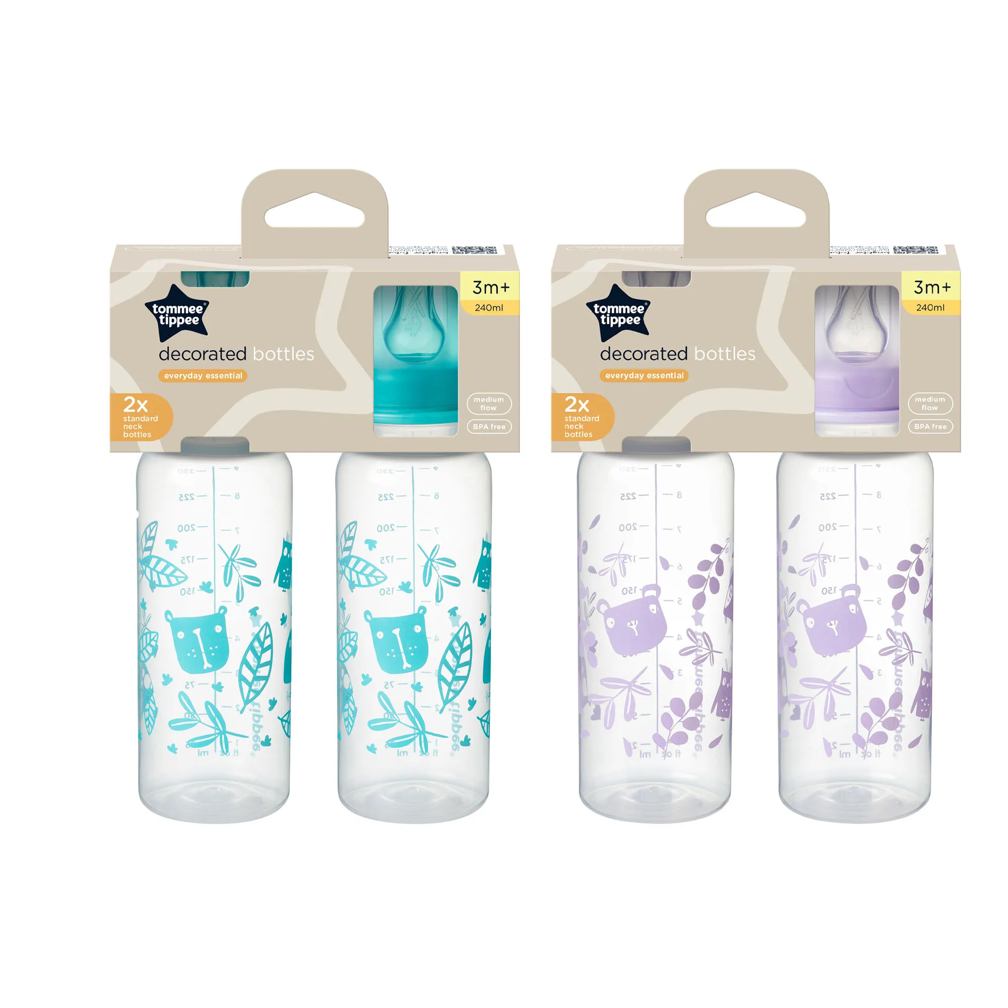Twin pack of 250ml standard baby bottles designed for easy feeding and comfort.