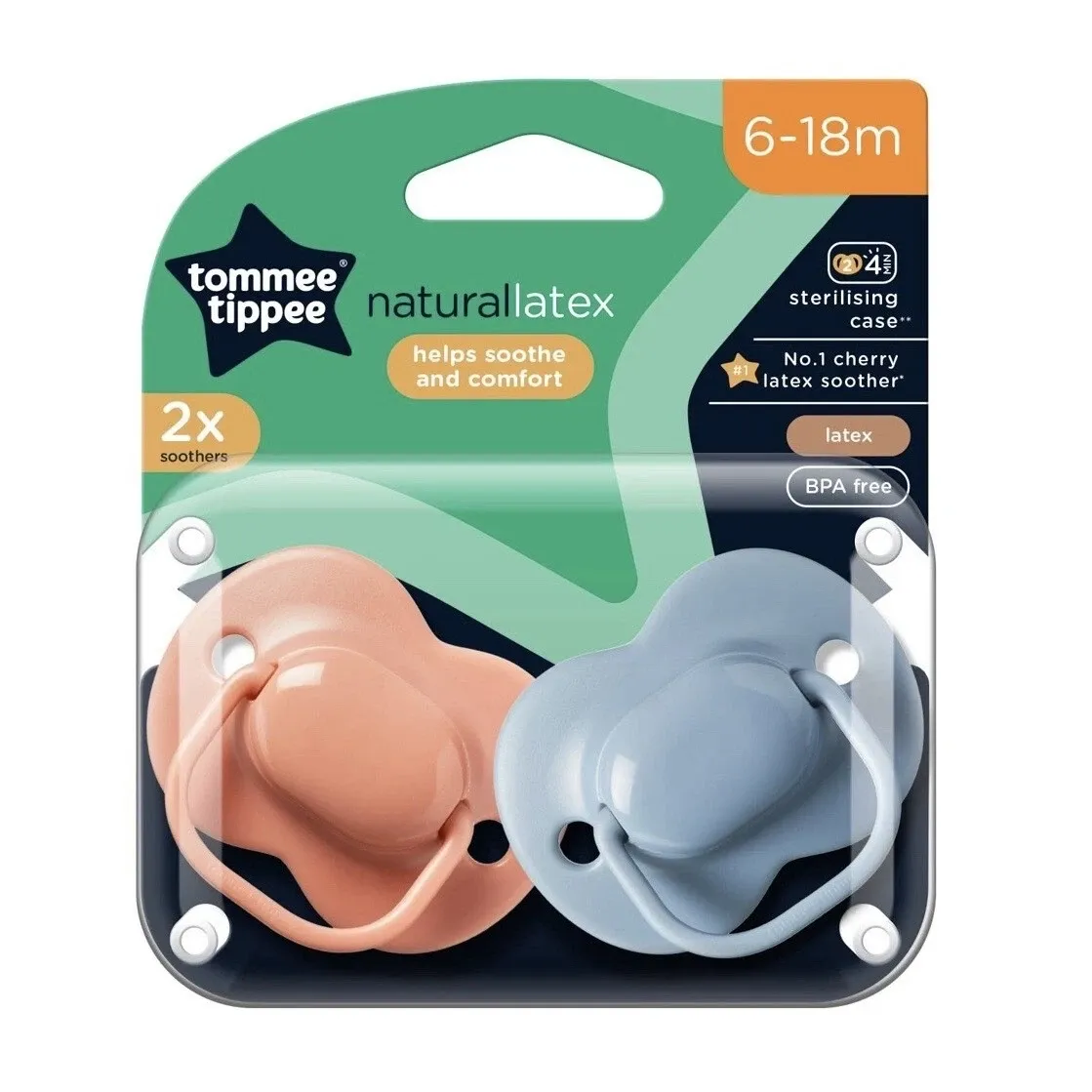 A pack of four cherry-shaped natural latex soothers designed for babies aged 6–18 months, offering a soft, flexible teat for soothing comfort.