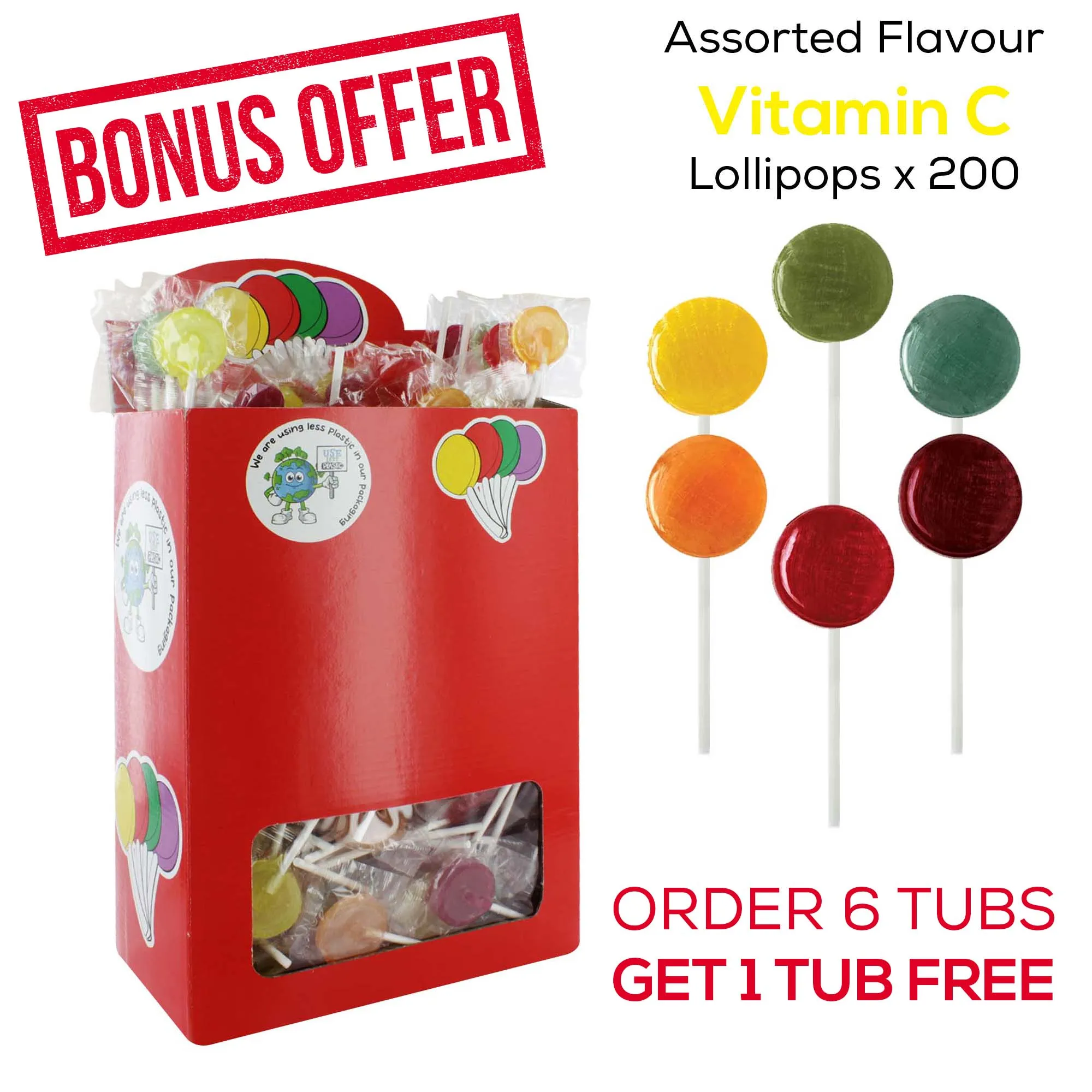 Vitamin C Lollipops x1200 (+200 Free) are a bulk confectionery pack ideal for retail, events, or giveaways. These fruity-flavoured lollipops are individually wrapped and enriched with Vitamin C, making them a popular choice for kids and adults alike. Perfect for party bags, promotions, or resale, they offer great value in a large quantity format.