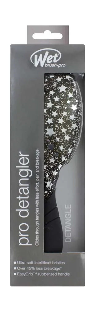 A stylish Wet Brush detangler with black glitter and star accents, designed to gently remove knots and tangles while adding sparkle to hair.